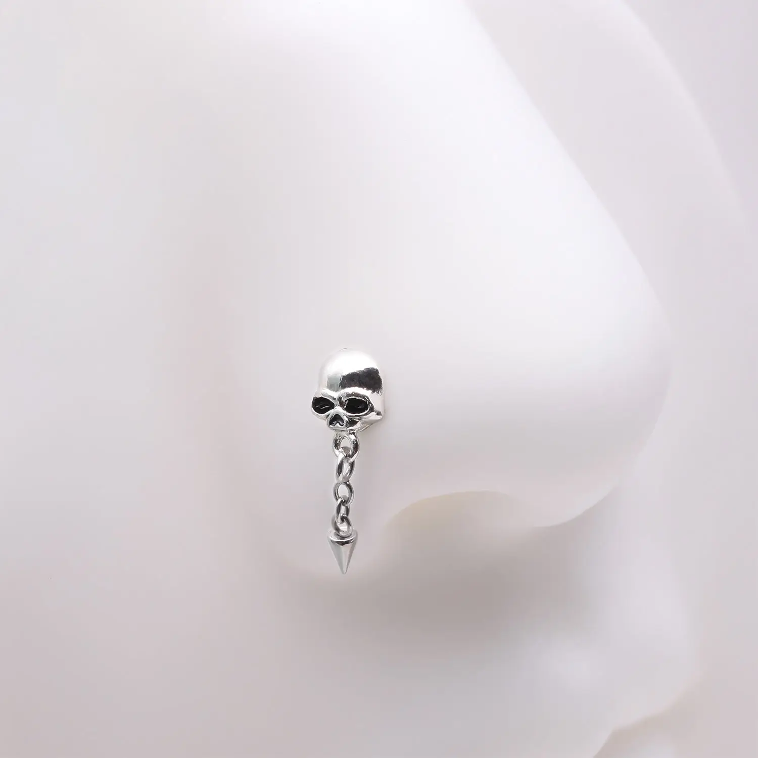 This Death Skull Dangle Chained Spike L-Shaped Nose Ring adds an edgy touch to your outfit. The dangle chain and spiked design give off a killer vibe, while the L-shape of the ring ensures a secure fit. Show off your rebellious side with this unique nose ring!