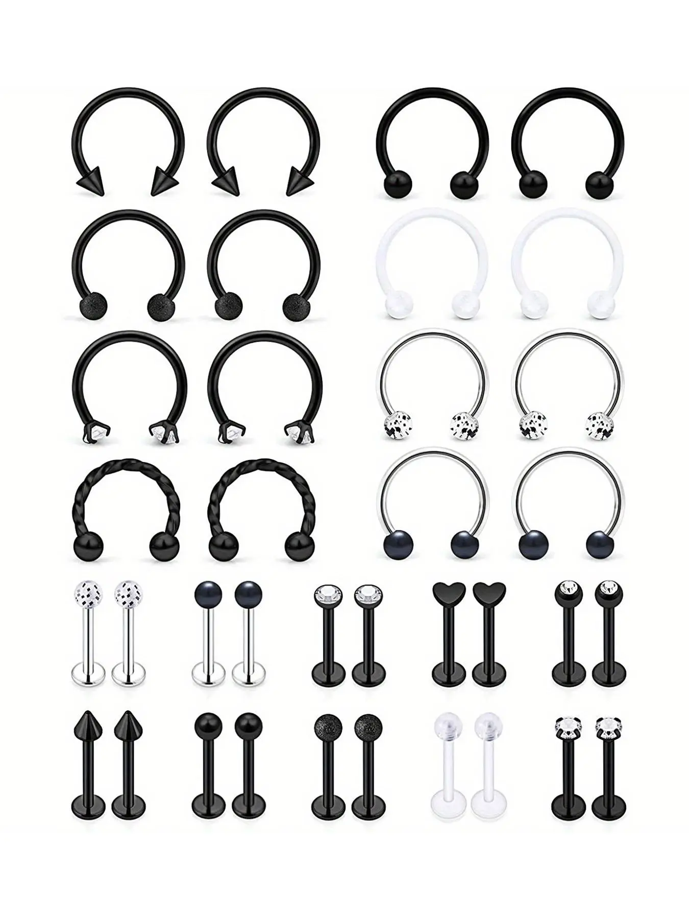 U-shaped Nose Ring, Spiral Nose Ring & Double Ball Lip Nail As Gift for Couple, 36pcs Stainless Steel Nose Rings, Lip Rings, Earrings, Body Piercing Jewelry for Men & Women