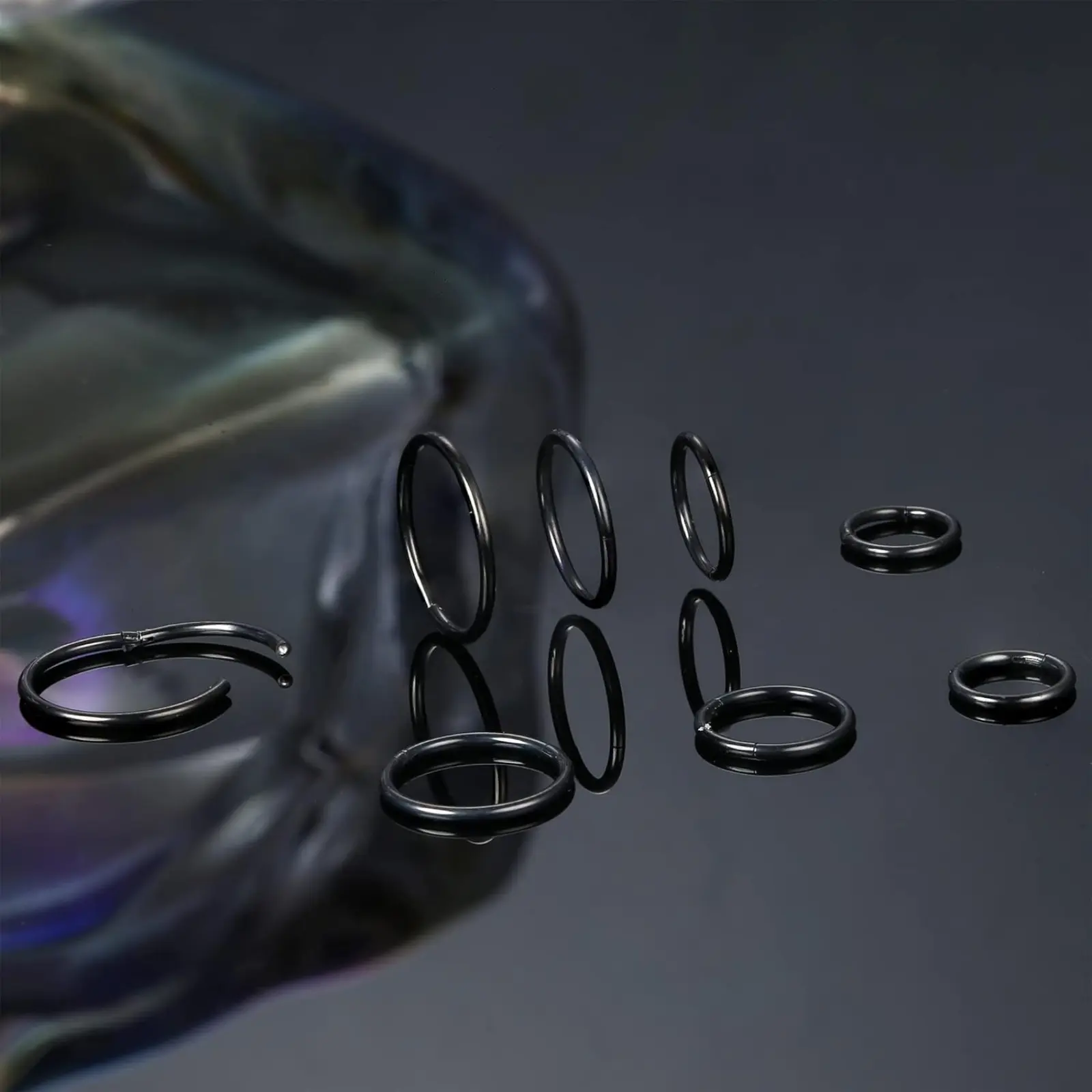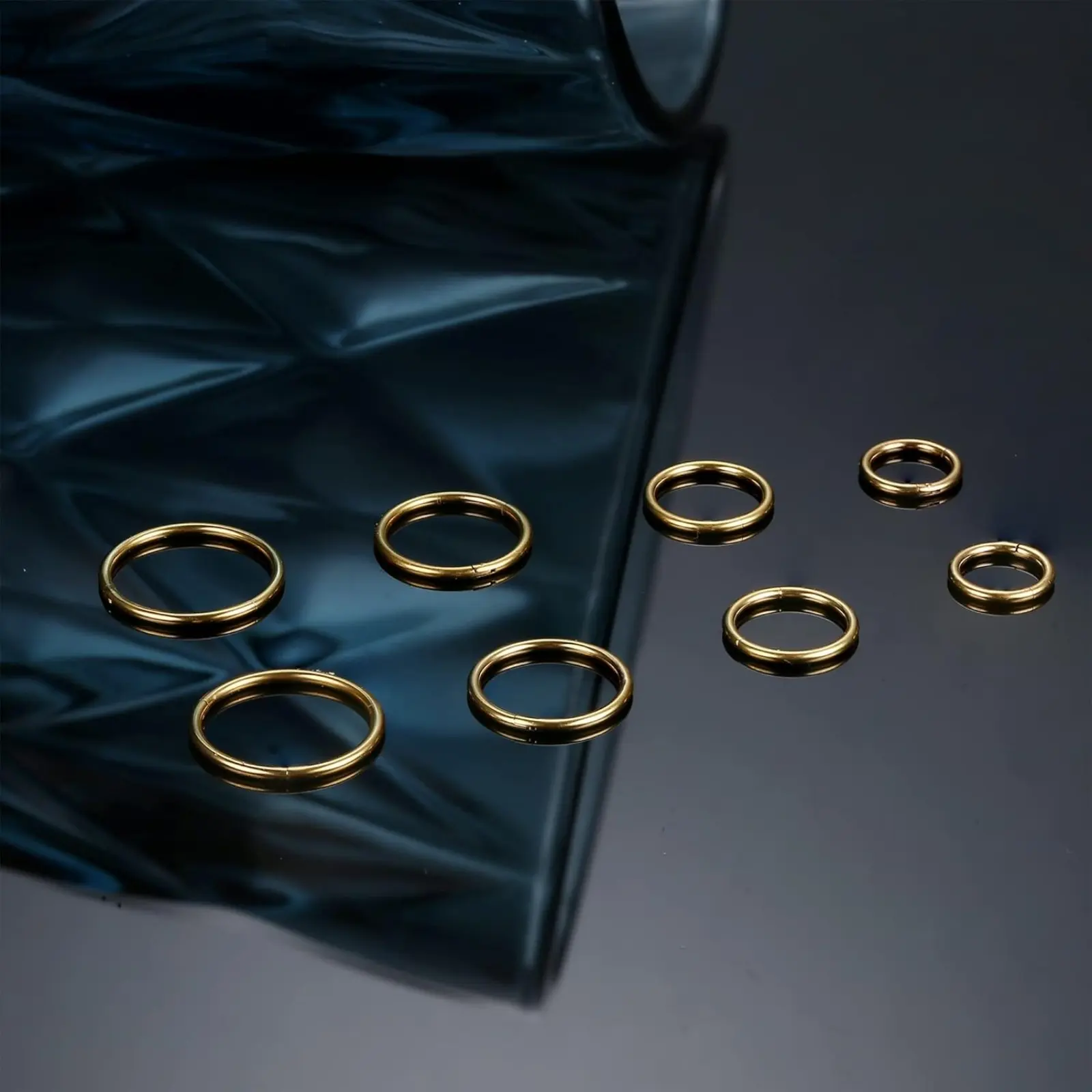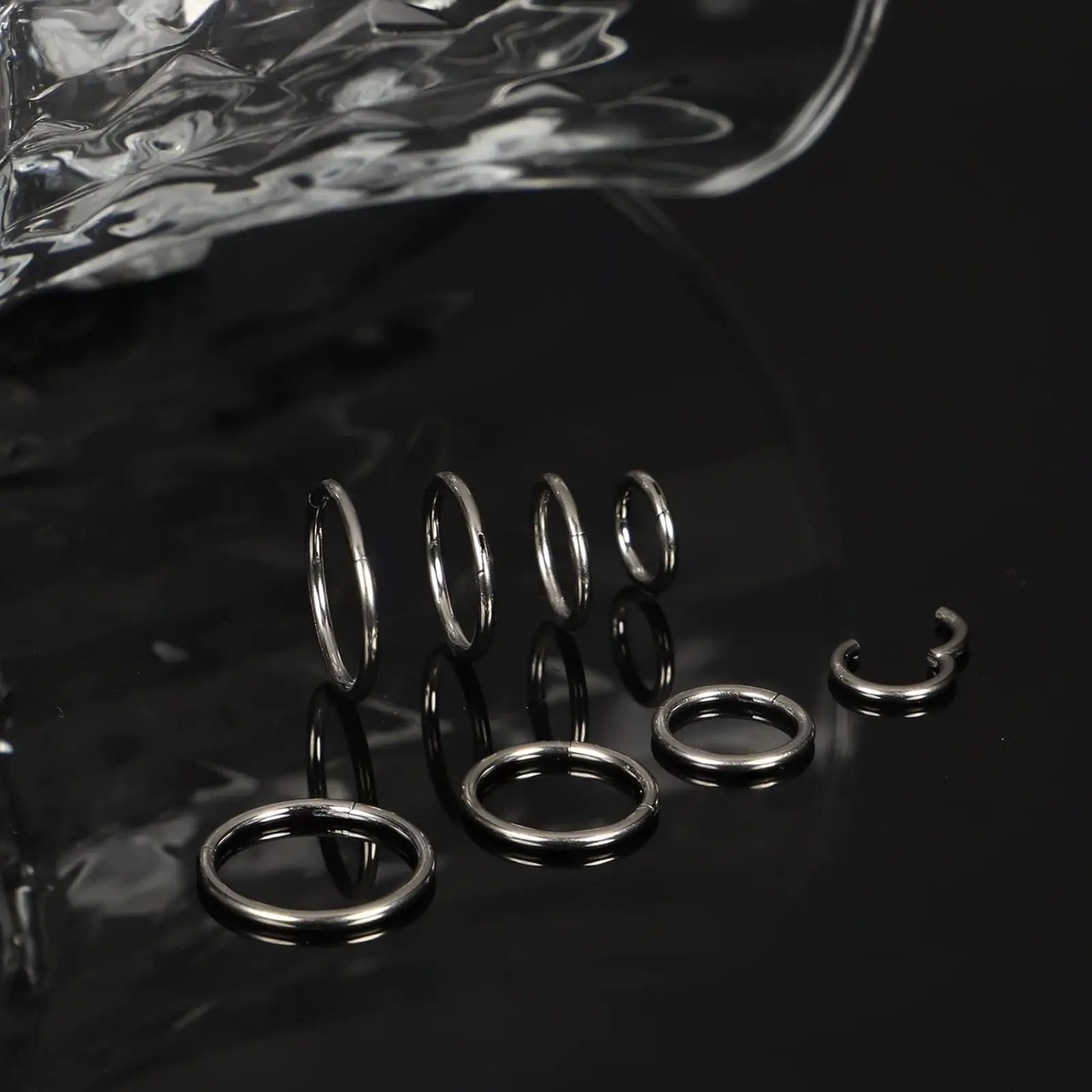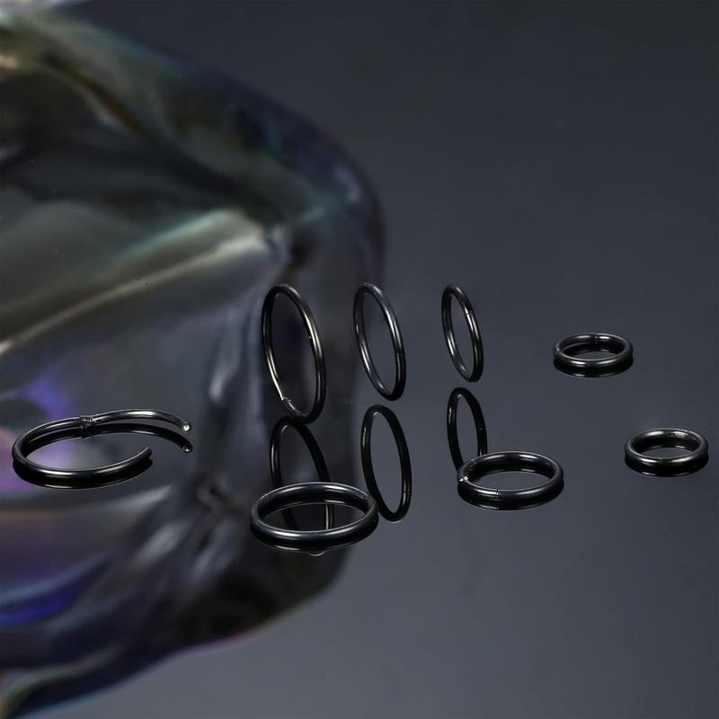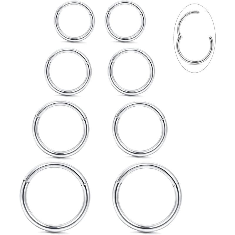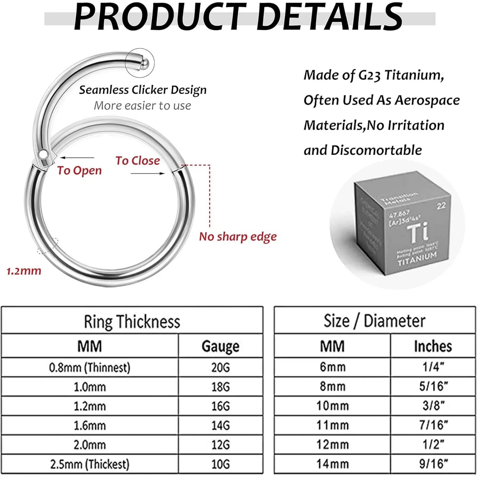 ·G23 TITANIUM NOSE RING: One order comes with 8pcs seamless improved clicker ring in different size.Gauge size:16G (1.2mm). Available in 4 colors: silver/gold/rose gold/black. Inner diameter ranges from 1/4"(6mm), 5/16" (8mm), 3/8" (10mm) to 1/2"(12mm). Various size for you to match. Give you changeful body piercing demands.