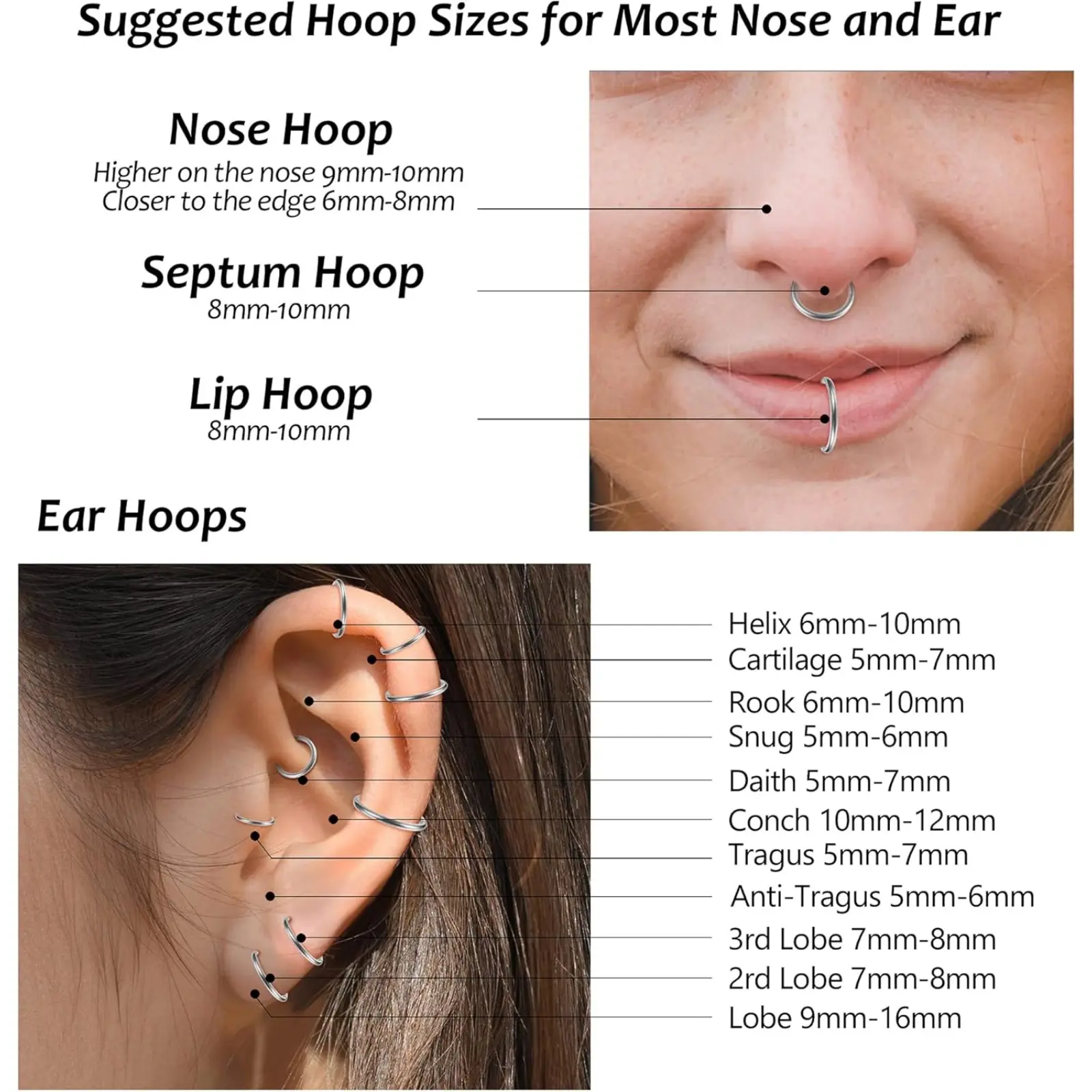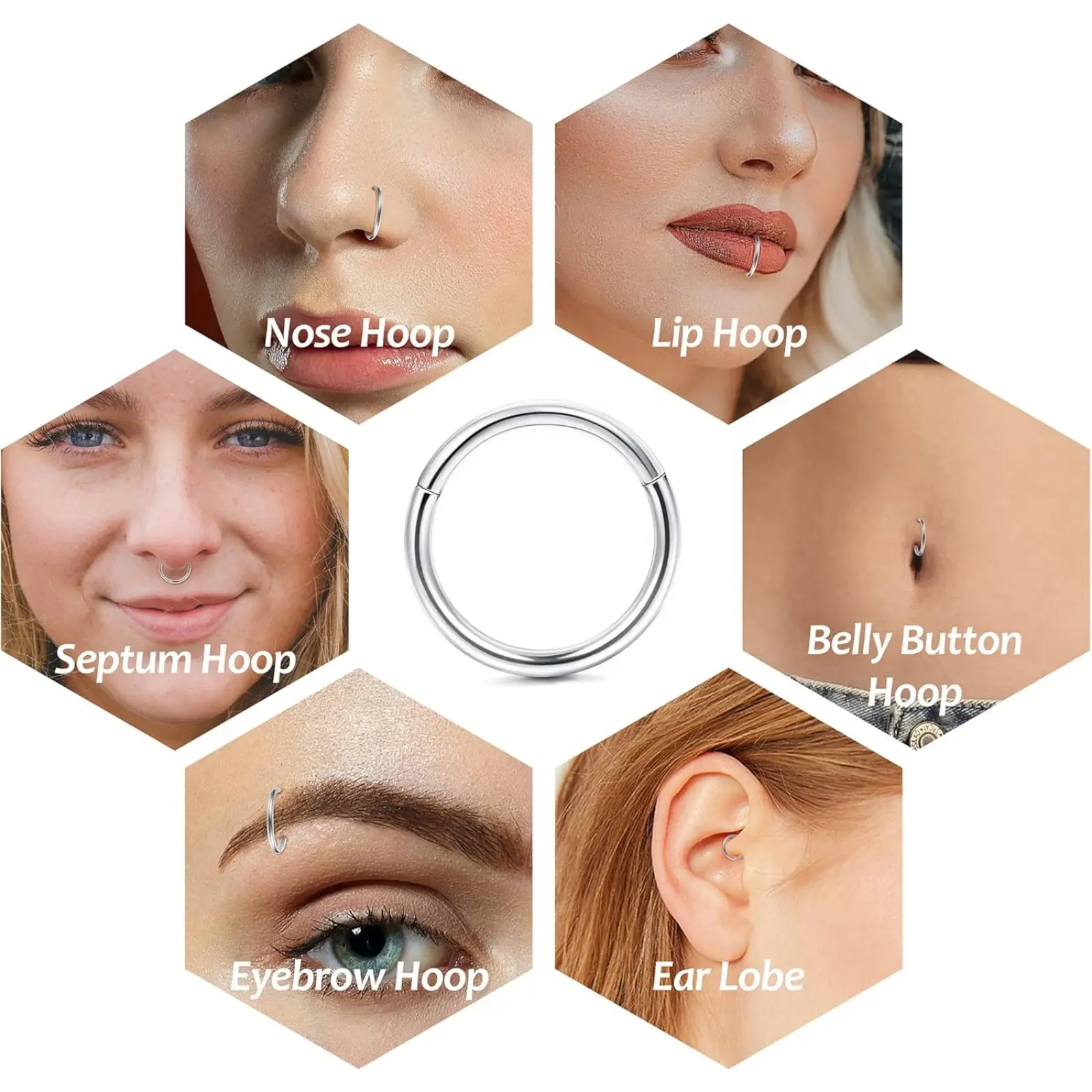 ·MULTIPLE USING: Minimalist style, stylish design, the body piering jewelry can be used as nose ring hoop, septum ring, lip ring, conch piercing, cartilage hoop earring, helix earring, daith earring, sleeper earring, tragus piercing, rook piercing, nipple ring, ear lobe earrings hoop, eyebow and belly piercings, ect.