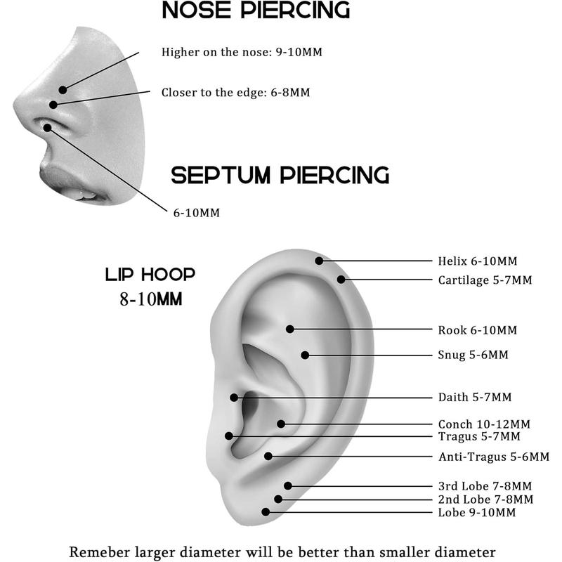 MULTIPLE USAGE: The 8mm hoops can be used for nose rings/septum rings/cartilage earrings/helix piercing. The 10mm hoops can be used as nose piercing/septum piercing/conch piercing jewelry/helix piercing jewelry/lip hoops.