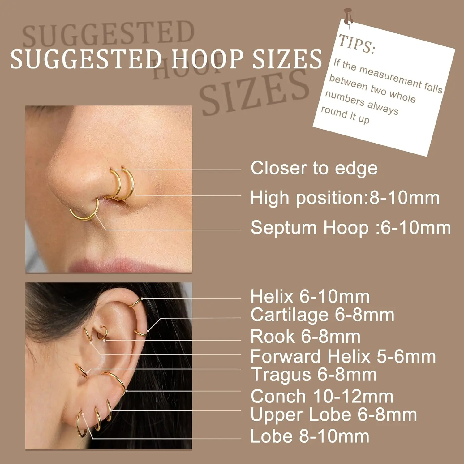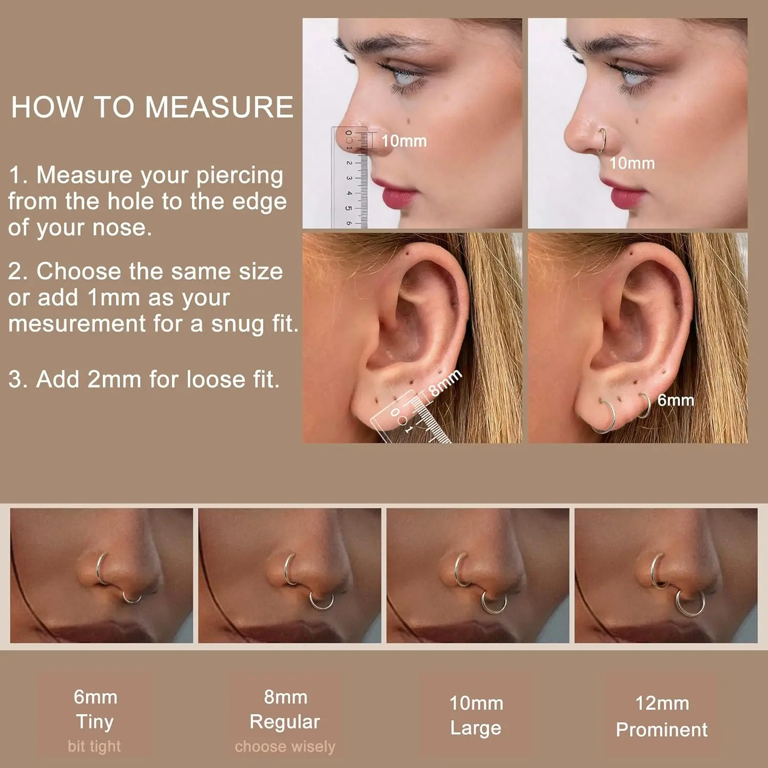 ·[Nose Hoop Size]-- 5count G23 titanium multi-color hoop clicker sleeper earrings are in same size, 16 Gauge (thickness: 1.2mm), inner diameter 6MM/8MM/10MM/12MM are available. Please check the inside diameter carefully according to the SIZE CHART OF THE HOOP NOSE RING. Select the most suitable size for yourself.