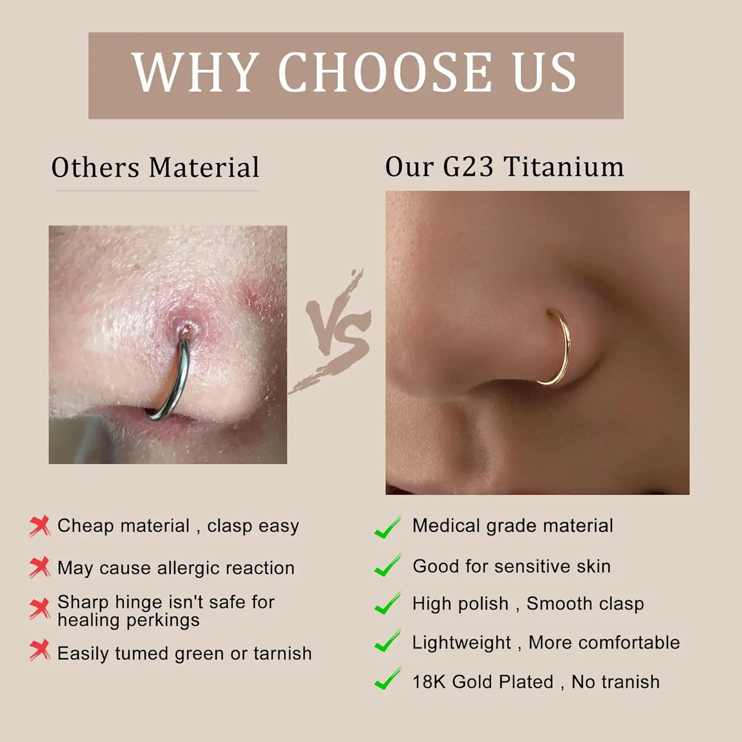 ·[G23 Titanium Nose Ring]-- The characteristics of titanium itself are high hardness and light weight, it will not rust even you drop it into seawater. Perfect for Nose, Cartilage, Septum, Tragus, Rook, Lips, Belly Ring and Nipple Piercing.