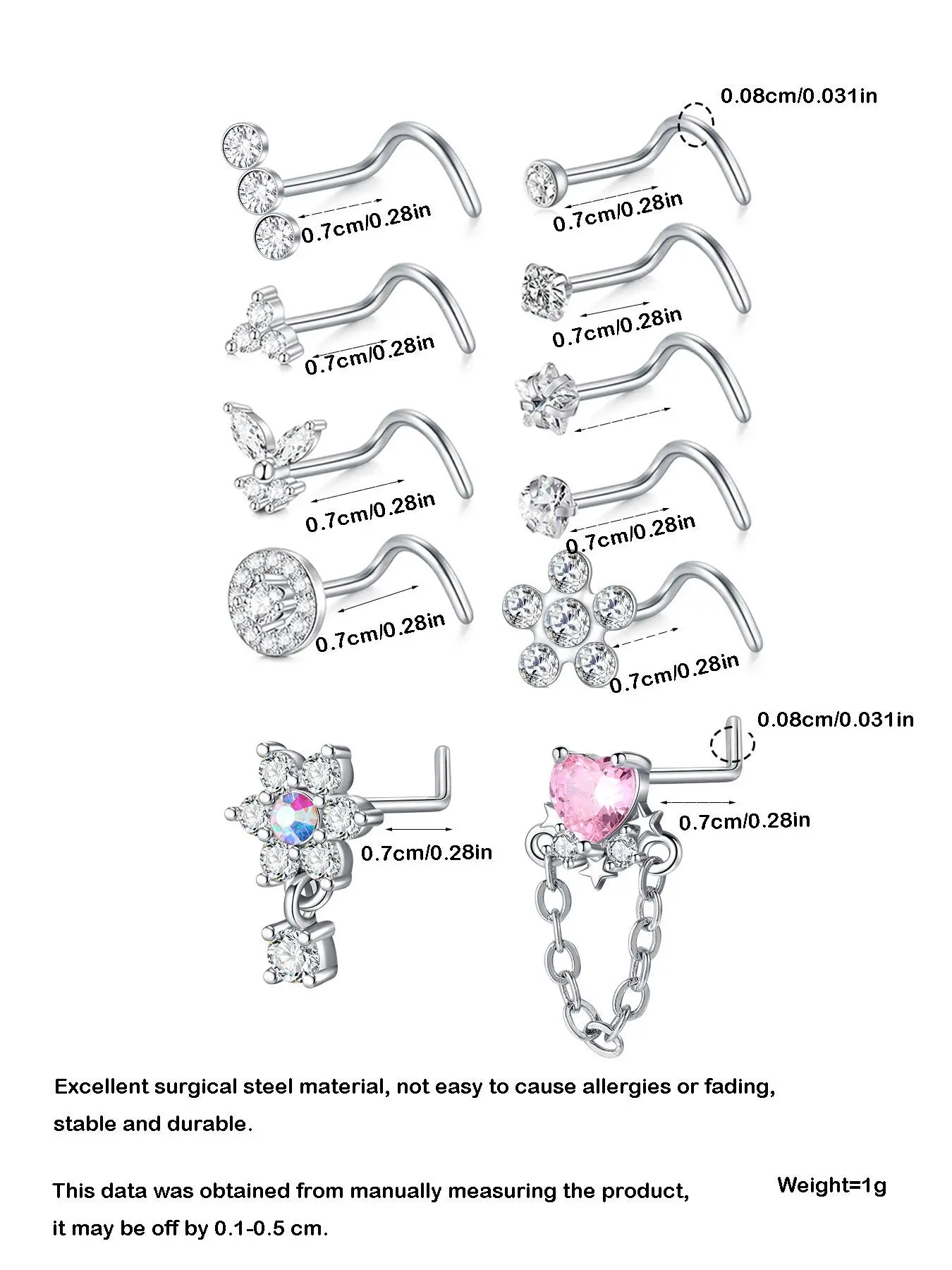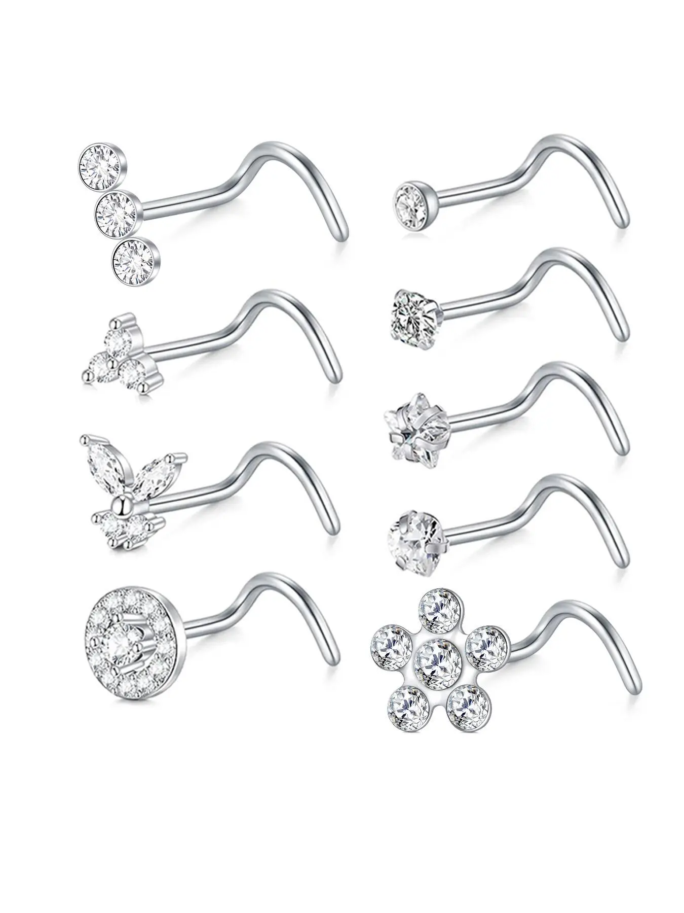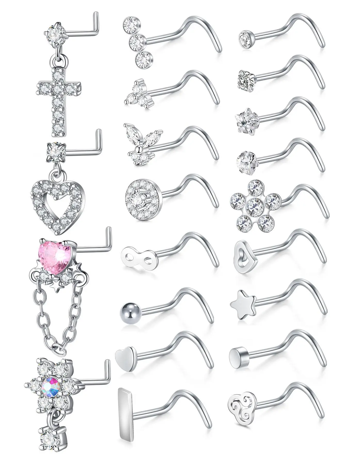 Rhinestone Decorated L-shaped Nose Rings, Spiral Nose Ring, Heart & Cross & Butterfly & Flower Design Nose Studs, Body Piercing Charm Jewelry for Women & Men, Nose Ring Jewelry, Septum Jewelry, Nose Piercings Kit