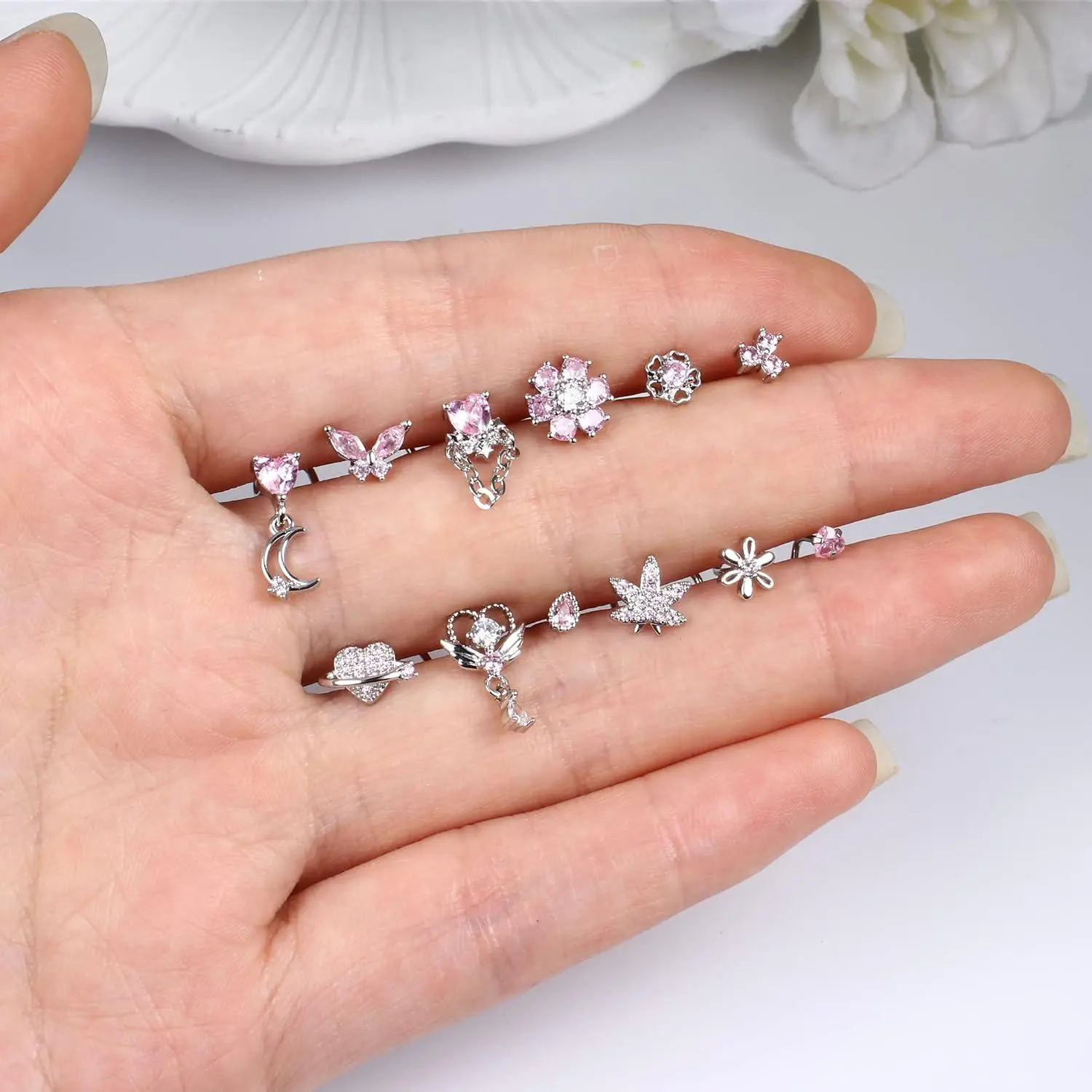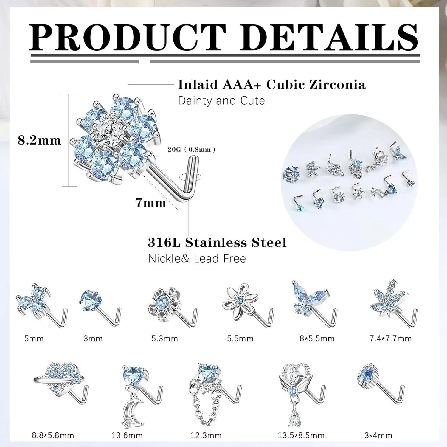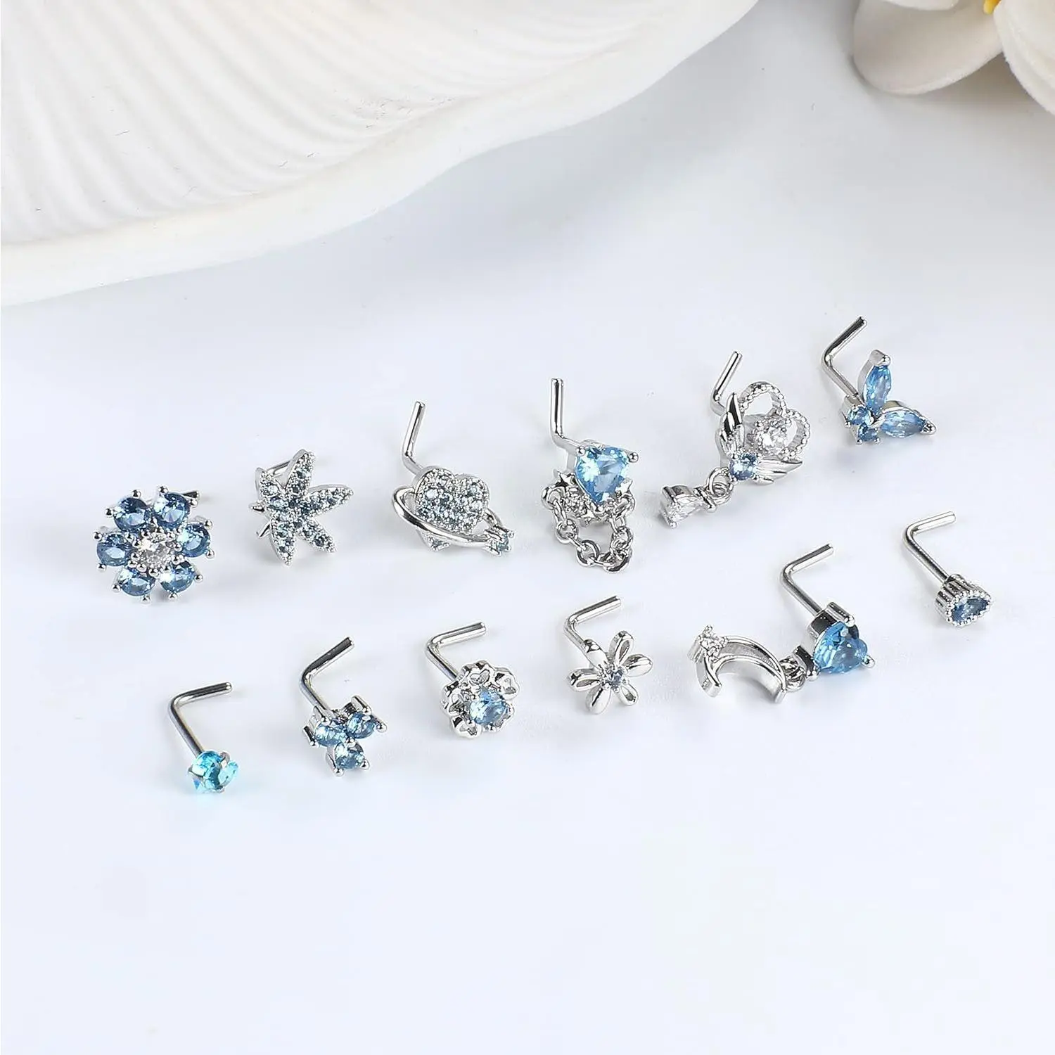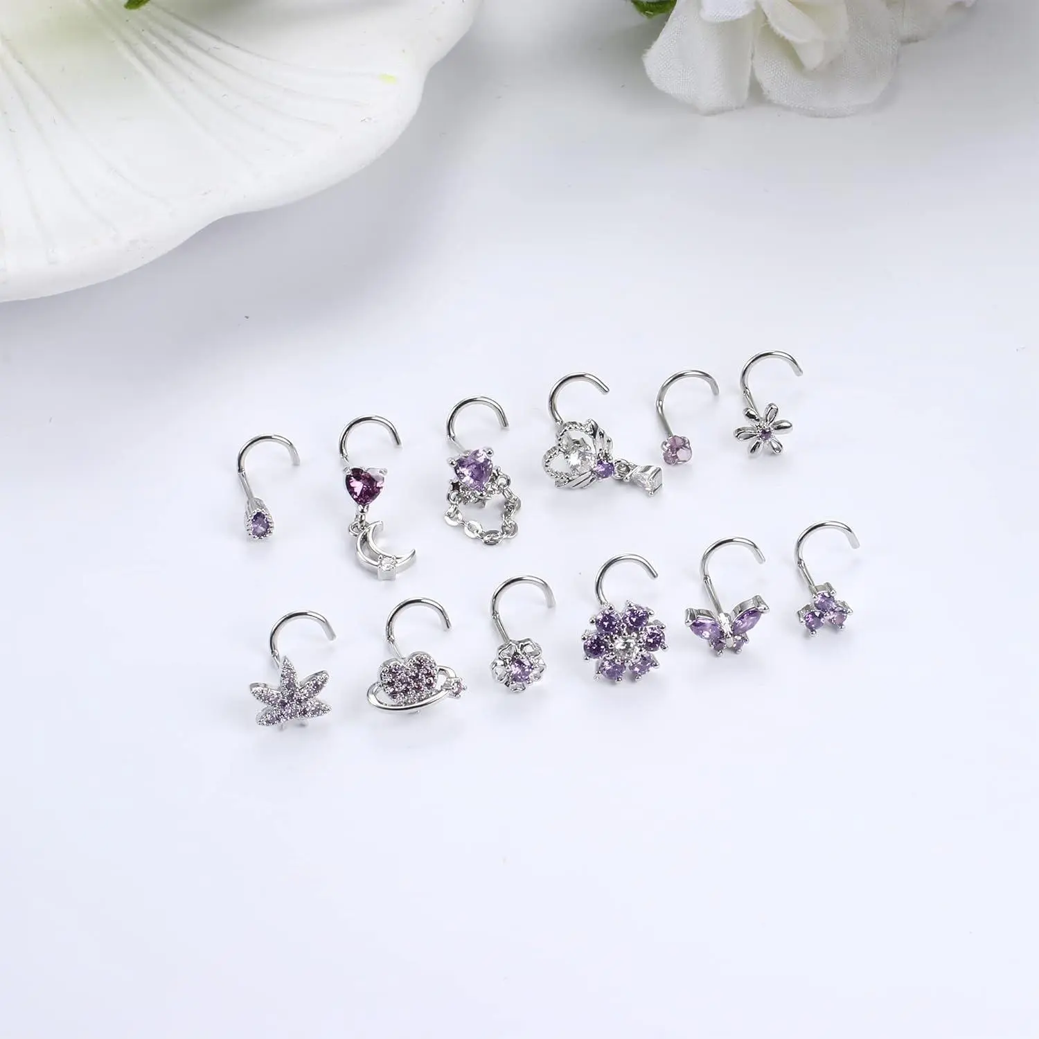 FLORIDECO presents 12 stainless steel L-shaped nose rings for women. These rings feature CZ heart, butterfly, flower, leaf, and moon dangle designs. They add charm to any look, perfect for daily wear. Available in pink, purple, blue, and clear, these rings are resistant to rust, tarnish, and corrosion. The L-shaped design ensures a comfortable fit.