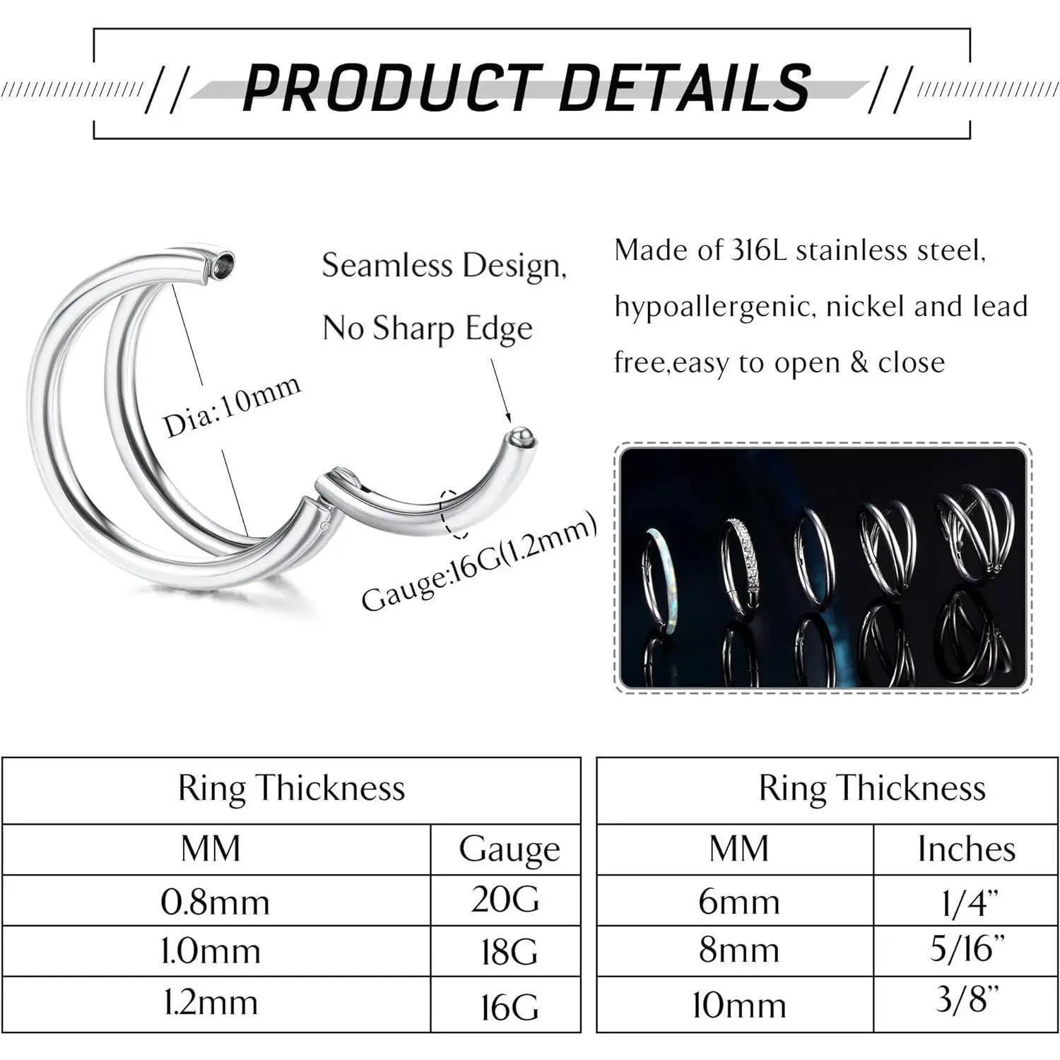 Got the PERFECT size!! Been needing a small lip ring and could never find one small enough.. UNTIL NOW!!! Absolutely love them! They’re all so pretty so I’m wearing all 5: my lip, my septum, one ear, and two in the other ear! Love them SO MUCH!!!