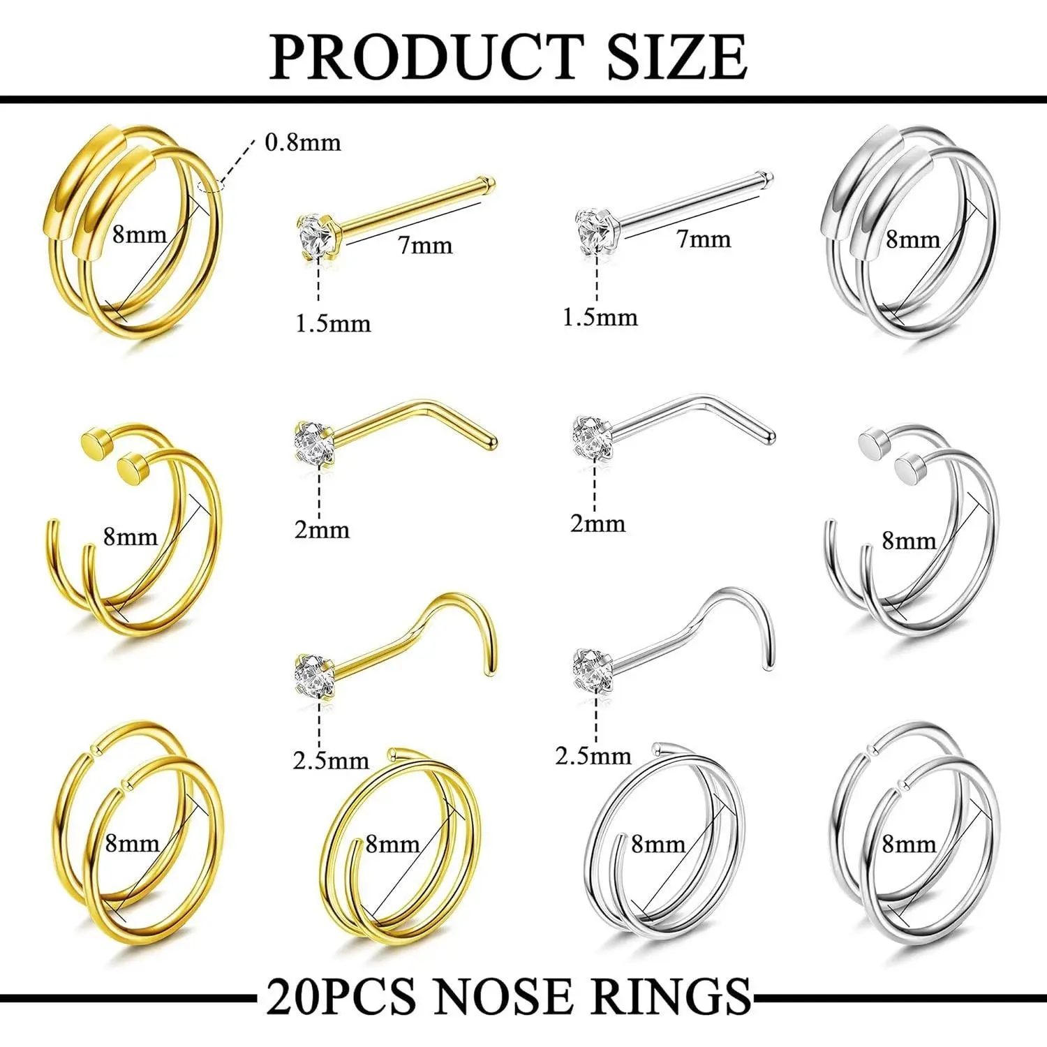 Size:20G=0.8mm,Hoop Nose Ring Inner Diameter: 8mm,Stud Cz Size:1.5mm,2mm and 2.5mm.These Nose Rings Hoops Are Well Polished by Hand,So They Are Not Sharp and Won't Scratch Your Skin. You Can Wear It Daily and It Goes Well with Anything!