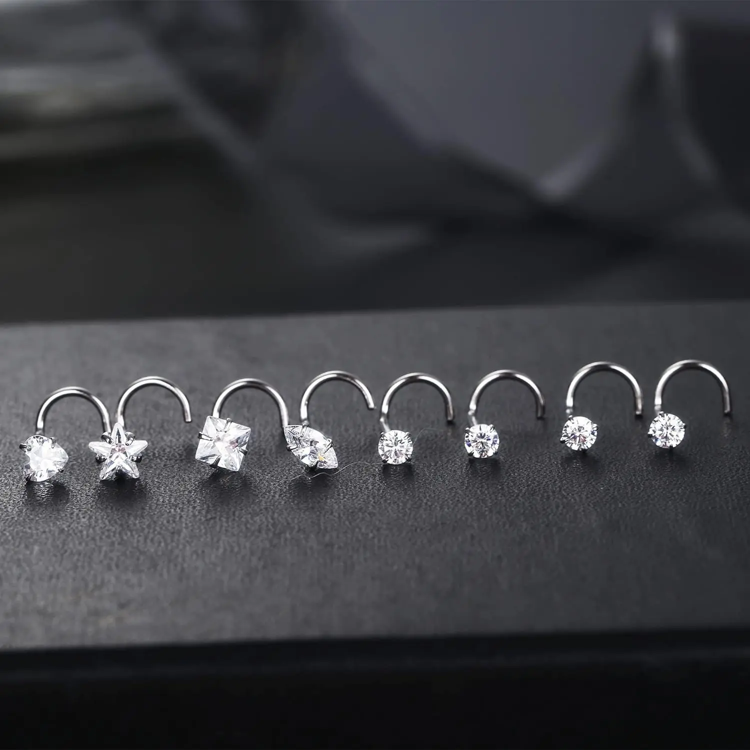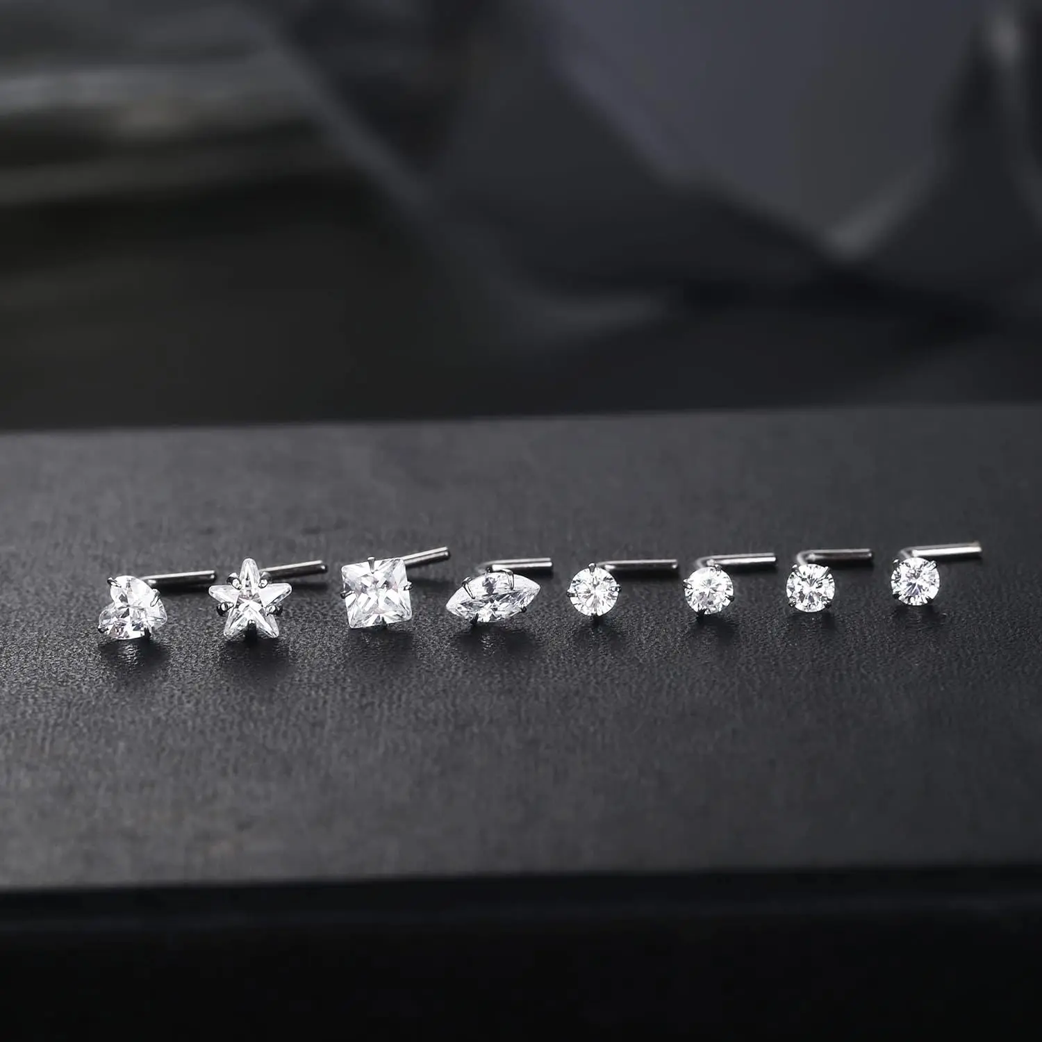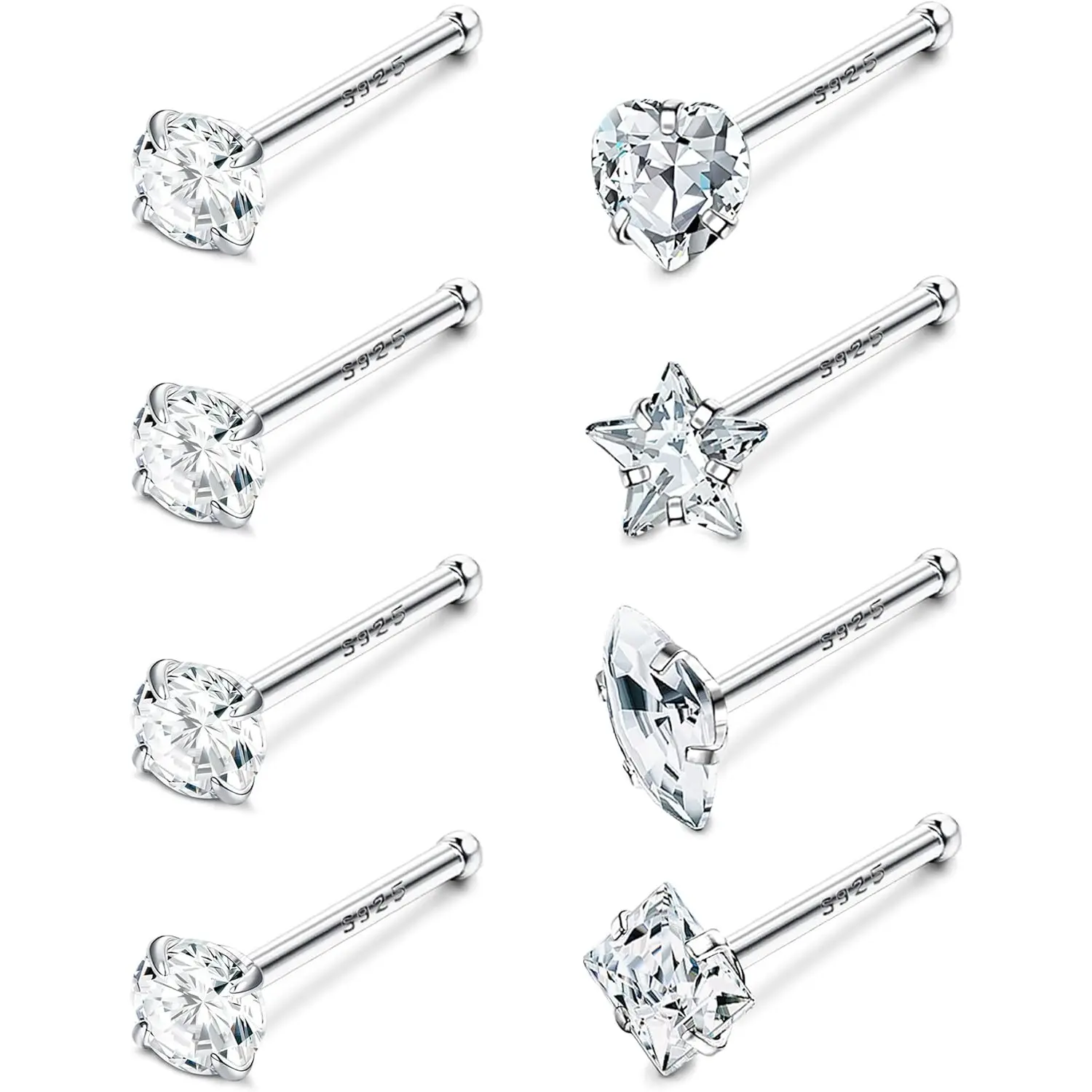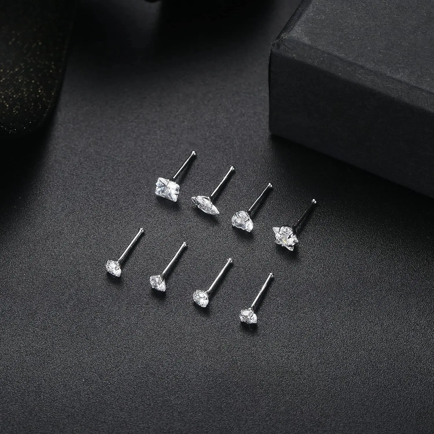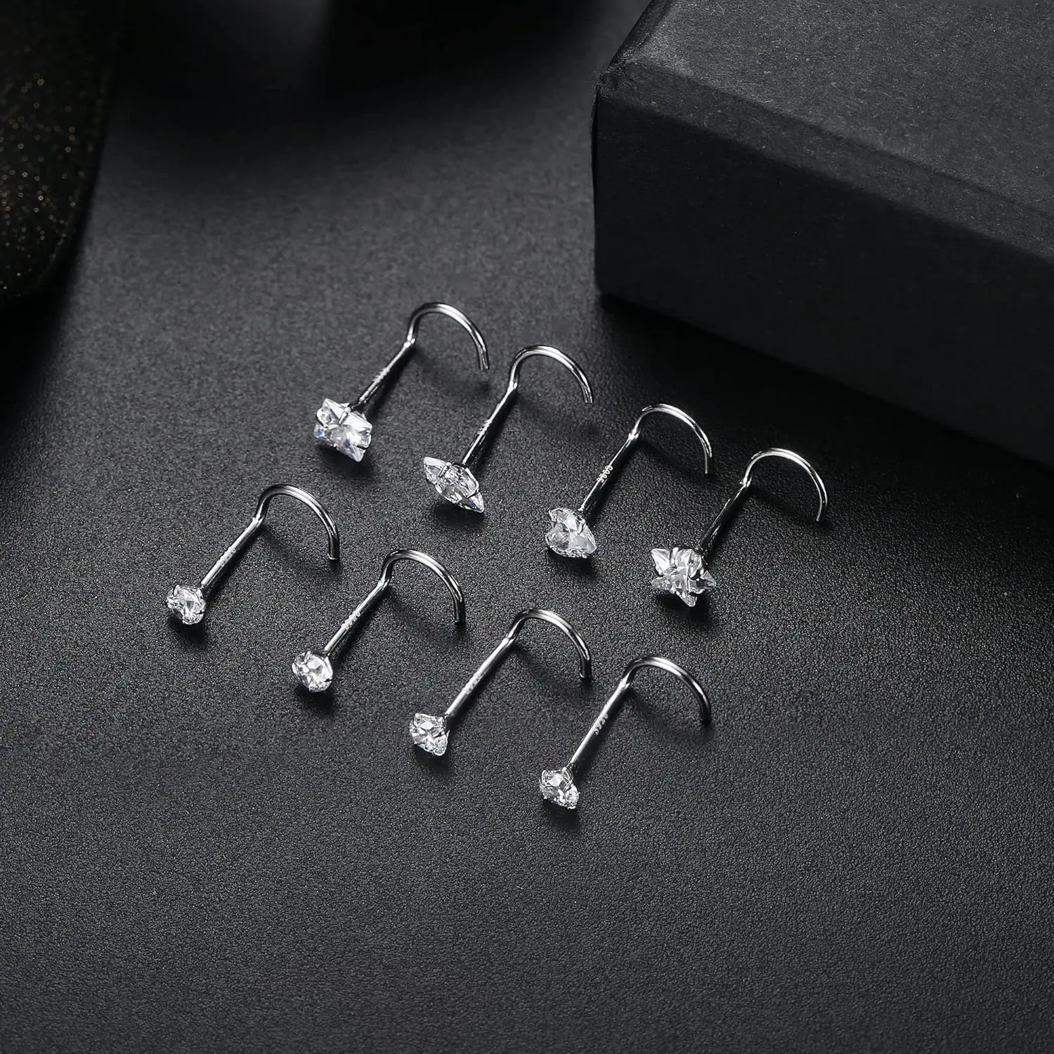 ·【What You Get】: 4count classic simulated nose studs (3mm round CZ tops)+ 4count cute nose rings studs (heart top & star top & marquise top & square top nose stud); Different shaped of sparkling cubic zirconia, chic and popular, meet your needs for beauty and fashion