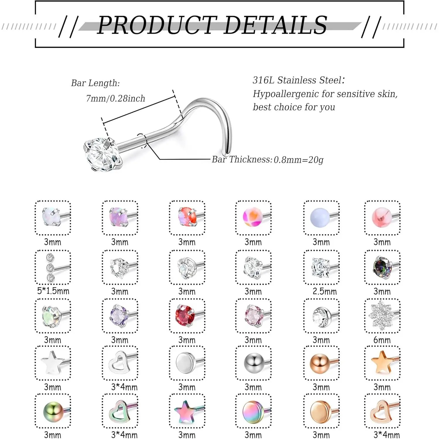 MILACOLATO 30Pcs 18G 20G Hypoallergenic Nose Ring Studs