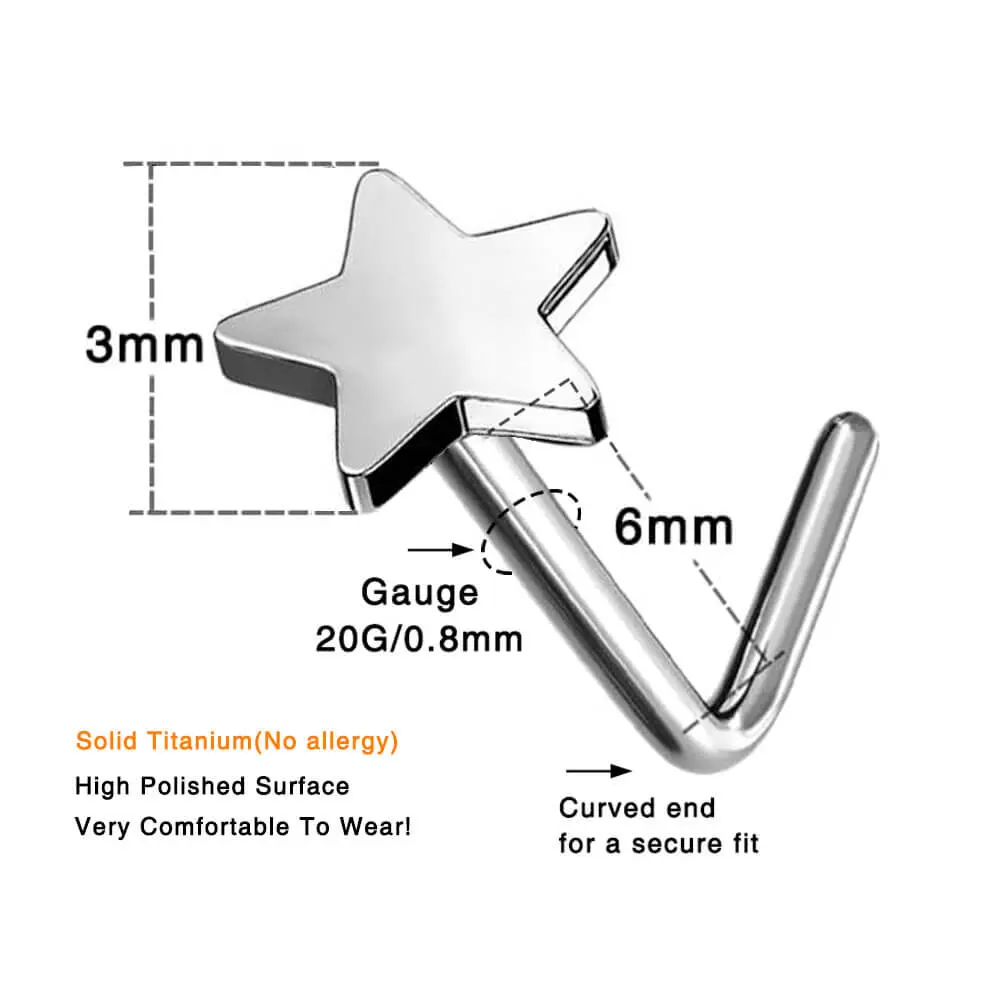 This pack contains one Oufer 20G Titanium L-shaped Star Nose Stud. It's designed specifically for females who want a basic yet stylish accessory that's easy and comfortable enough for daily use. Whether you're dressing up or down, the star shape adds the perfect finishing touch that will make you stand out from the crowd in all occasions!