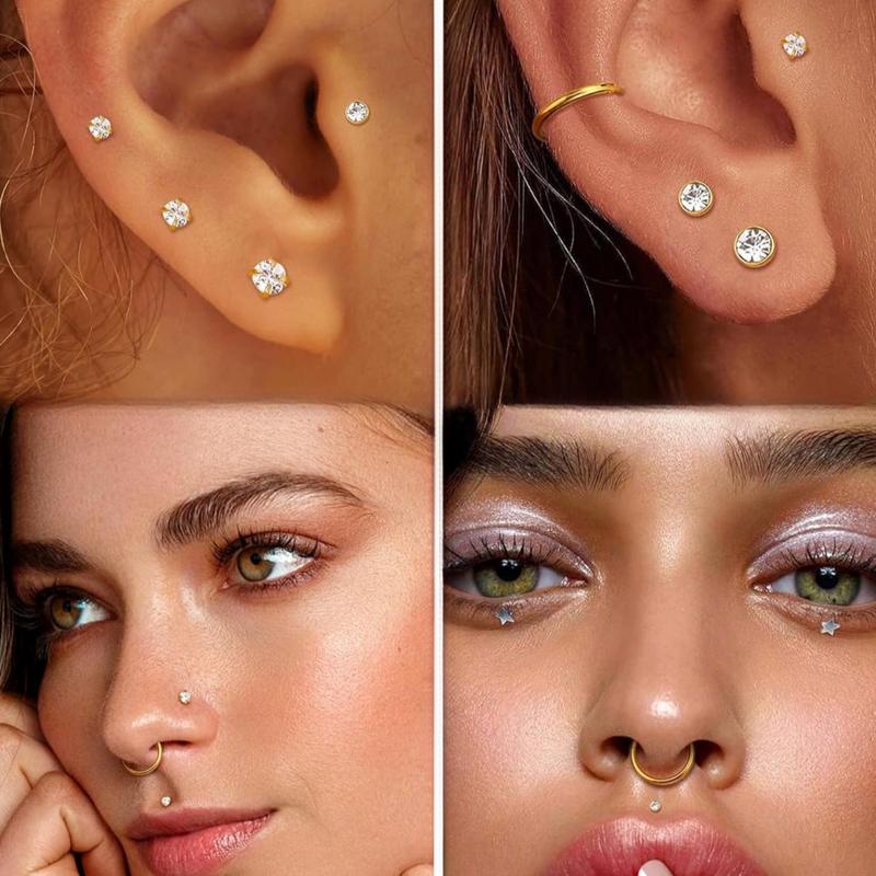 ·NOSE RINGS HOOPS AND NOSE STUDS SET: You can get 11pcs 14K gold plated hoop nose rings and threadless nose studs sets: including 3pcs clicker hoop nose and 8 pcs threadless flat back earrings in different cubic zirconia diameters; This set provides you with multiple wearing choices to match your mood and style preferences effortlessly