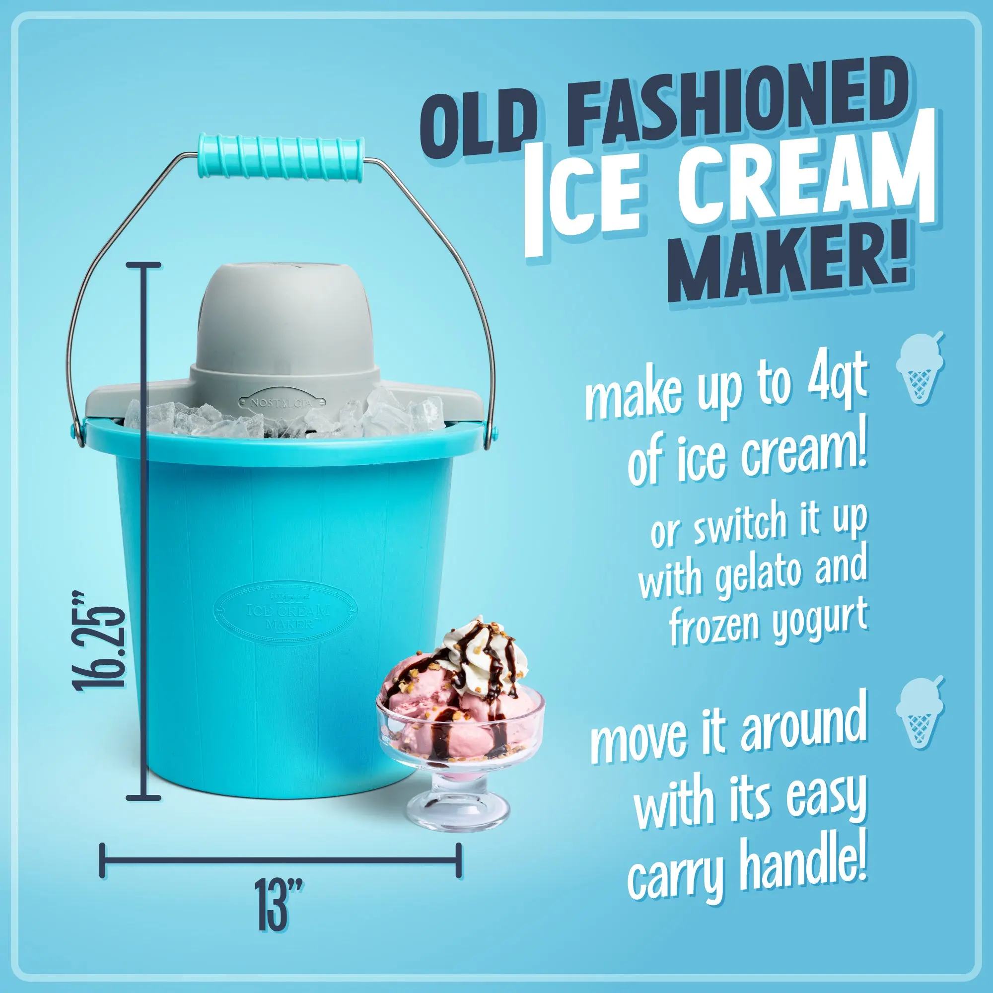 A carrying handle attached to the bucket makes it convenient to move your ice cream wherever it needs to go. No manual effort is needed thanks to the powerful electric motor. 🚀