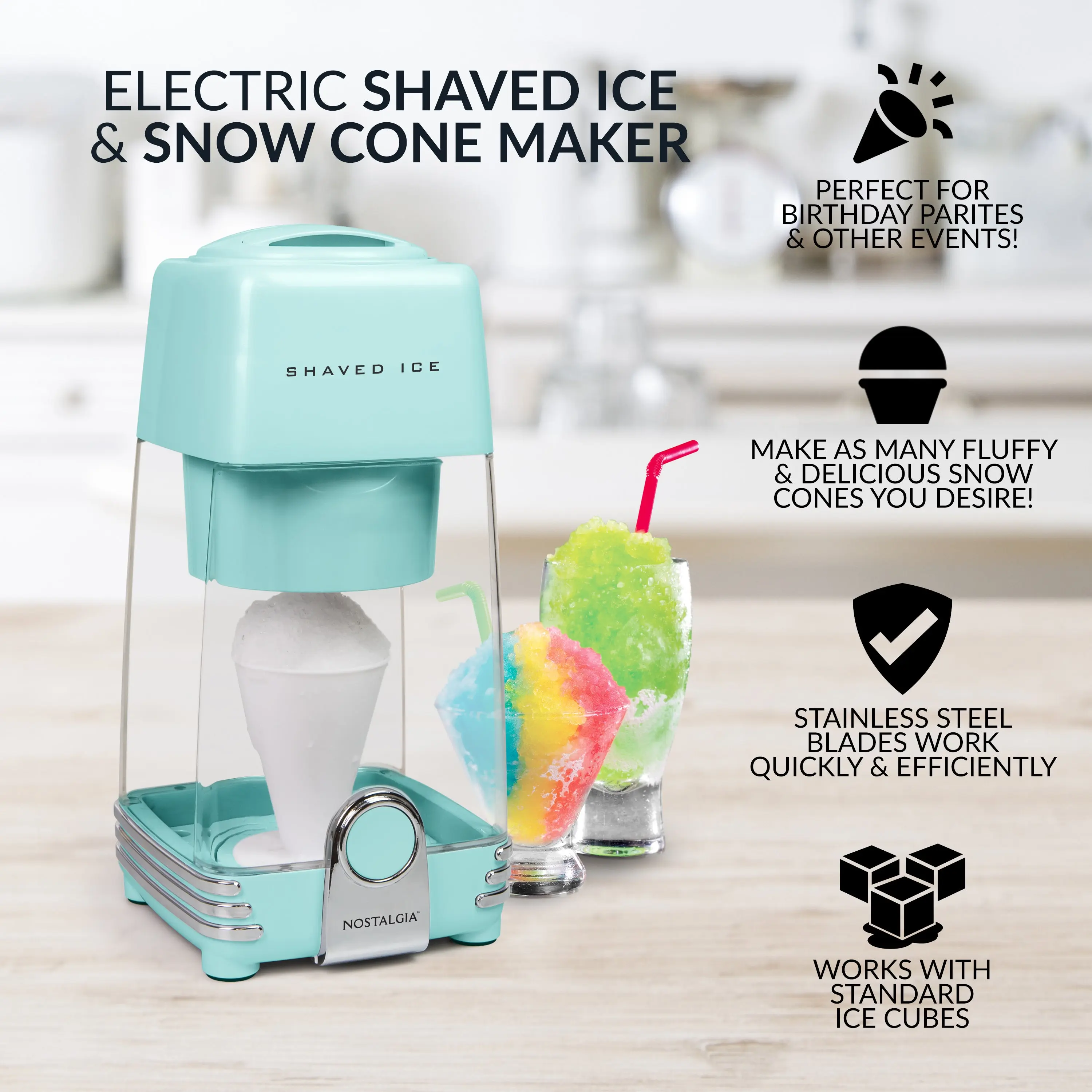Party Pleaser 🎉- Easily make delicious fluffy snow cones for all.- Perfect for birthday parties and other big events to bring a smile to everyone's face.