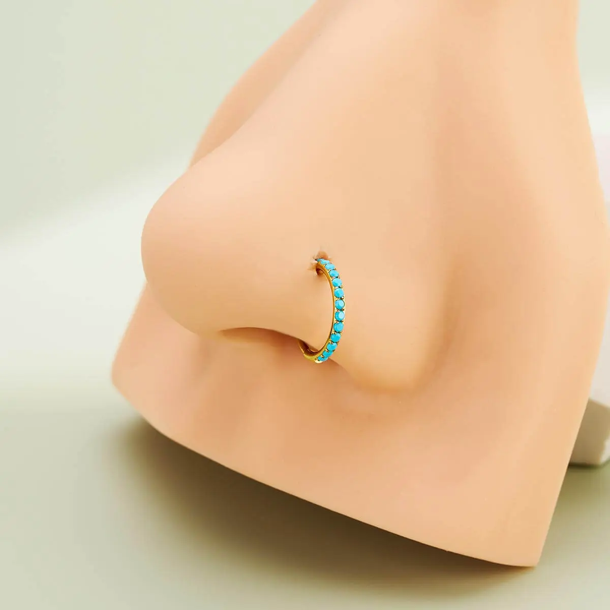 This turquoise nose ring is a charming and vibrant accessory that brings color to your nose piercing.