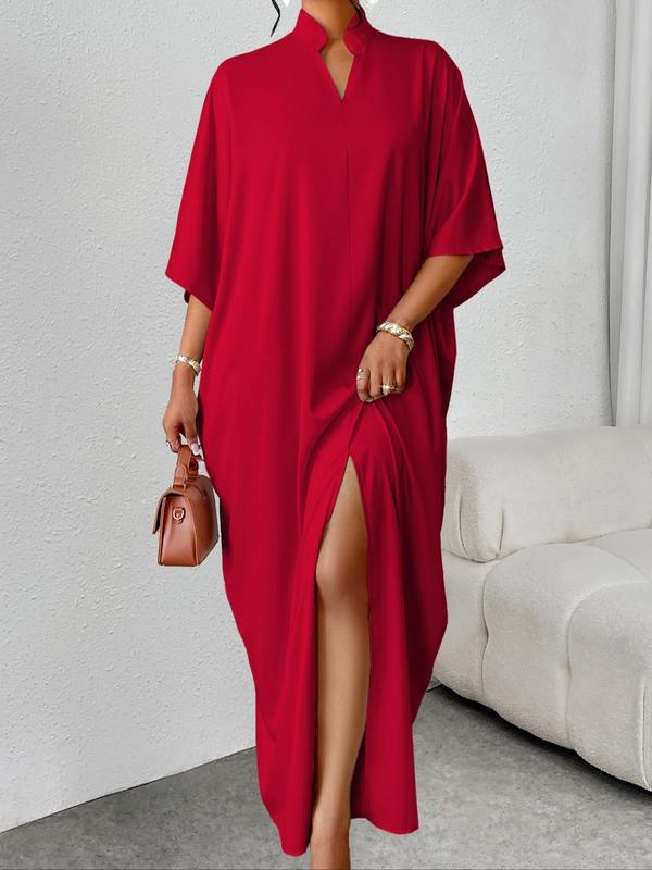 Women's Plain Notched Neck Split Hem Long Dress, Elegant Fashion Casual Dress for Daily Outdoor Wear, Women Dress for Summer