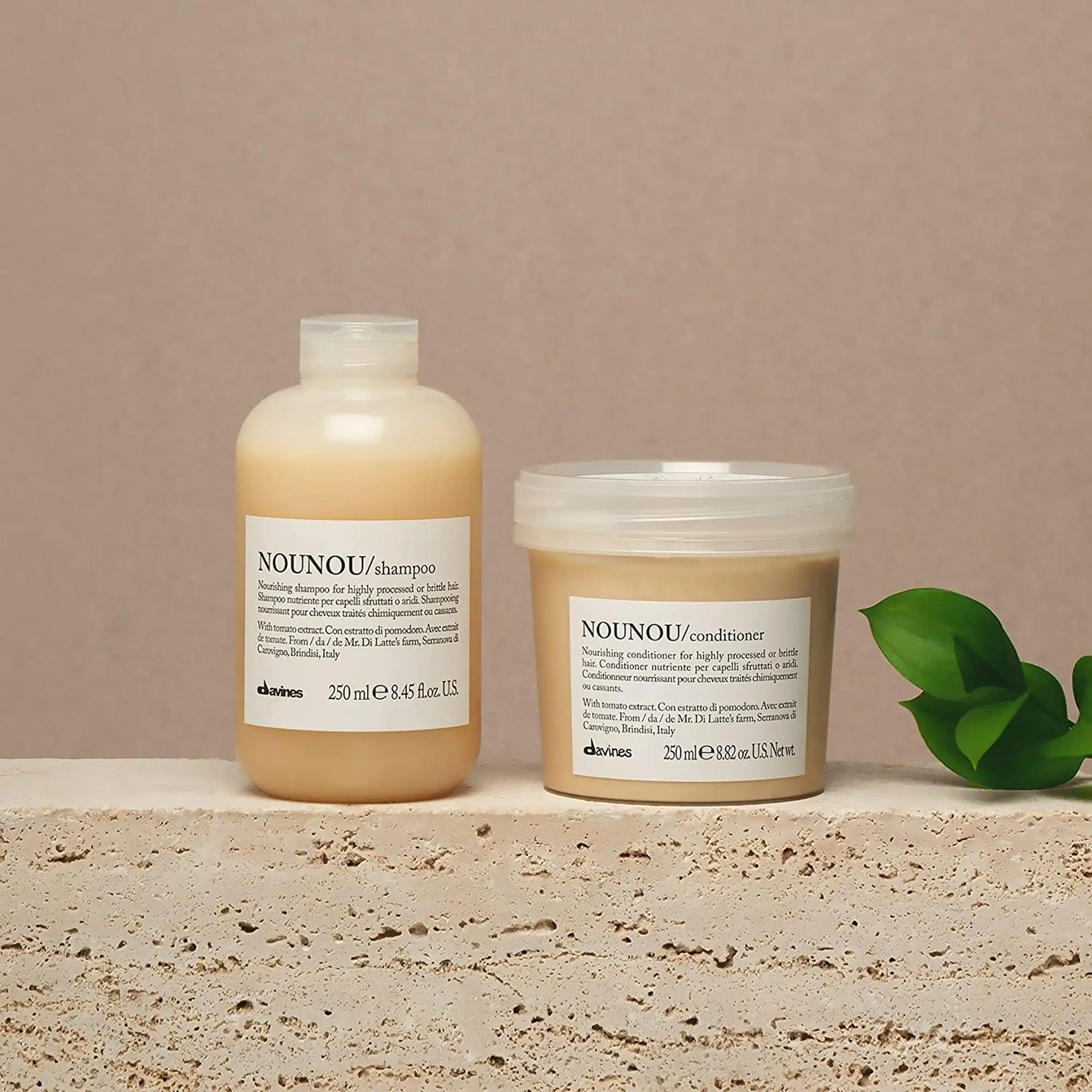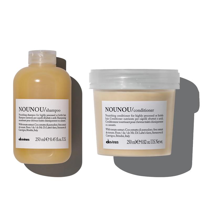 The Davines NOUNOU Duo Set is a nourishing haircare routine for bleached, permed, or relaxed hair. This duo helps repair distressed strands, keeping hair healthy and vibrant. The shampoo gently cleanses treated hair, providing nourishment and hydration. The conditioner moisturizes and detangles without weighing hair down.