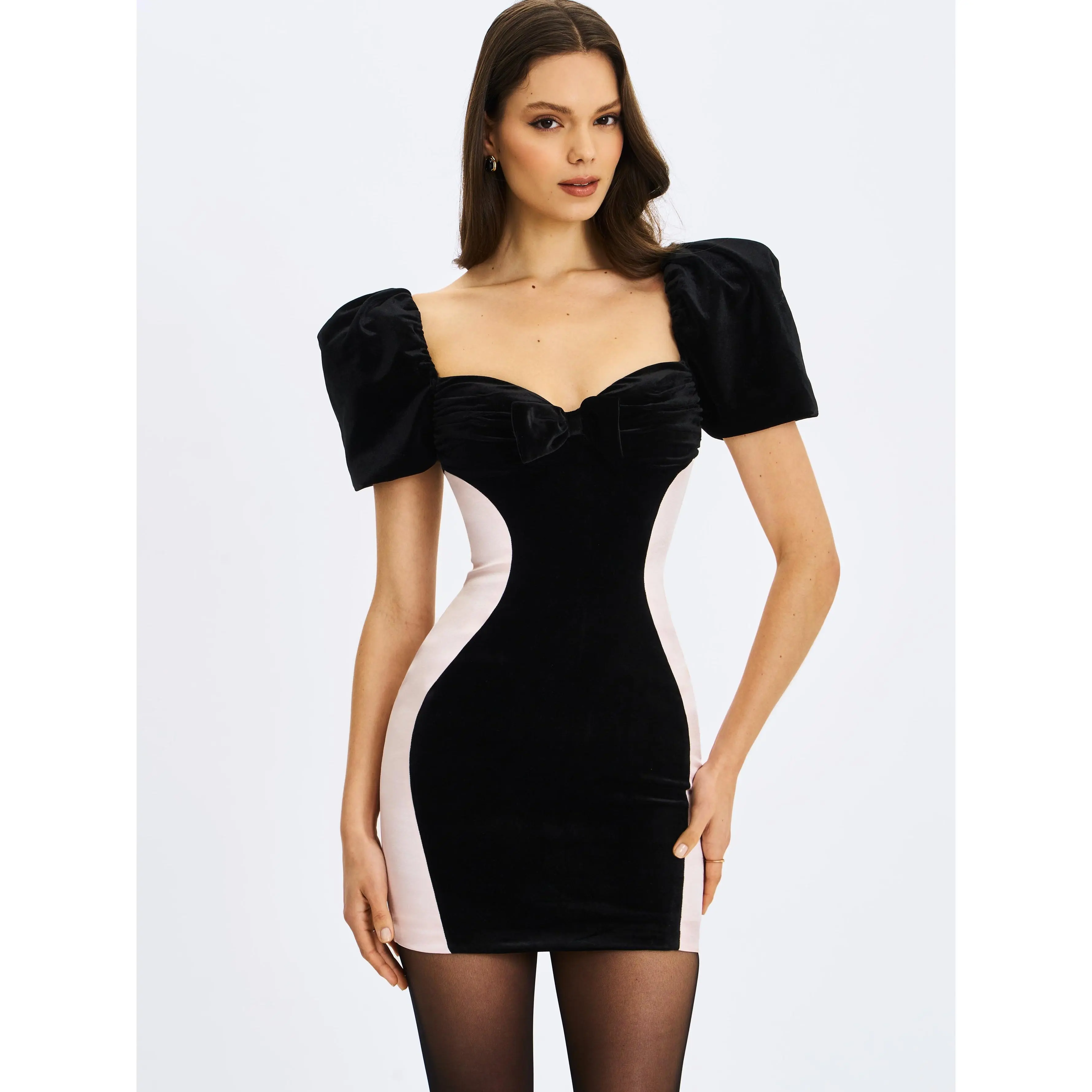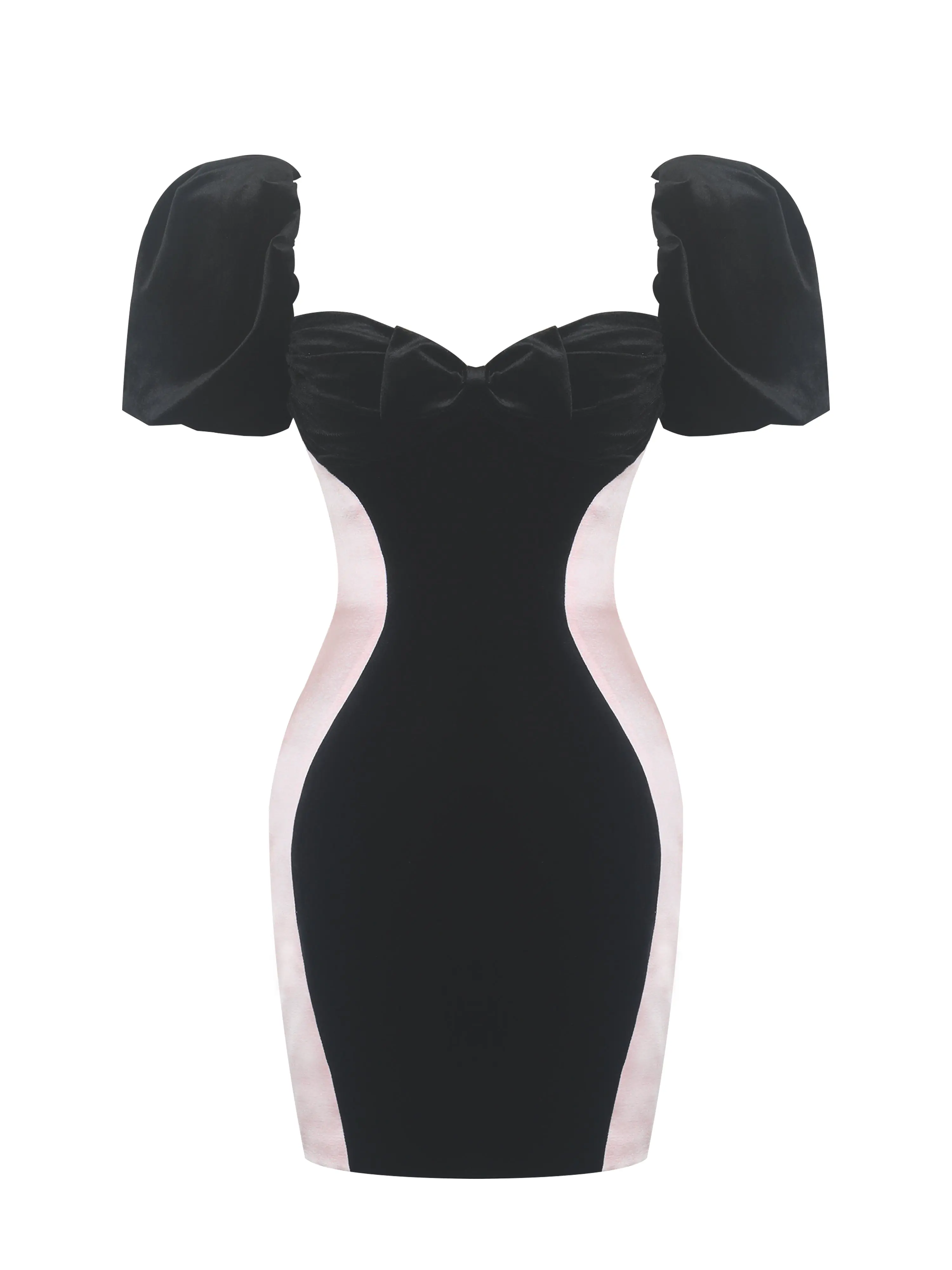 The Nova Dress is your flirty-meets-feminine answer to the party season. With puffy short sleeves and a square sweetheart neckline, it’s designed to frame the décolletage beautifully, while ruching across the bust and a bow at the center add a playful finish. Light pink satin side panels curve along the body for a sculpted effect, contrasting perfectly with the black velvet base. Built-in cups offer support, a back tie strap and invisible zipper keep the fit secure, and the full satin lining makes it as comfortable as it is striking. The dress to wear when you want to turn heads at holiday soirées and late-night plans alike.
