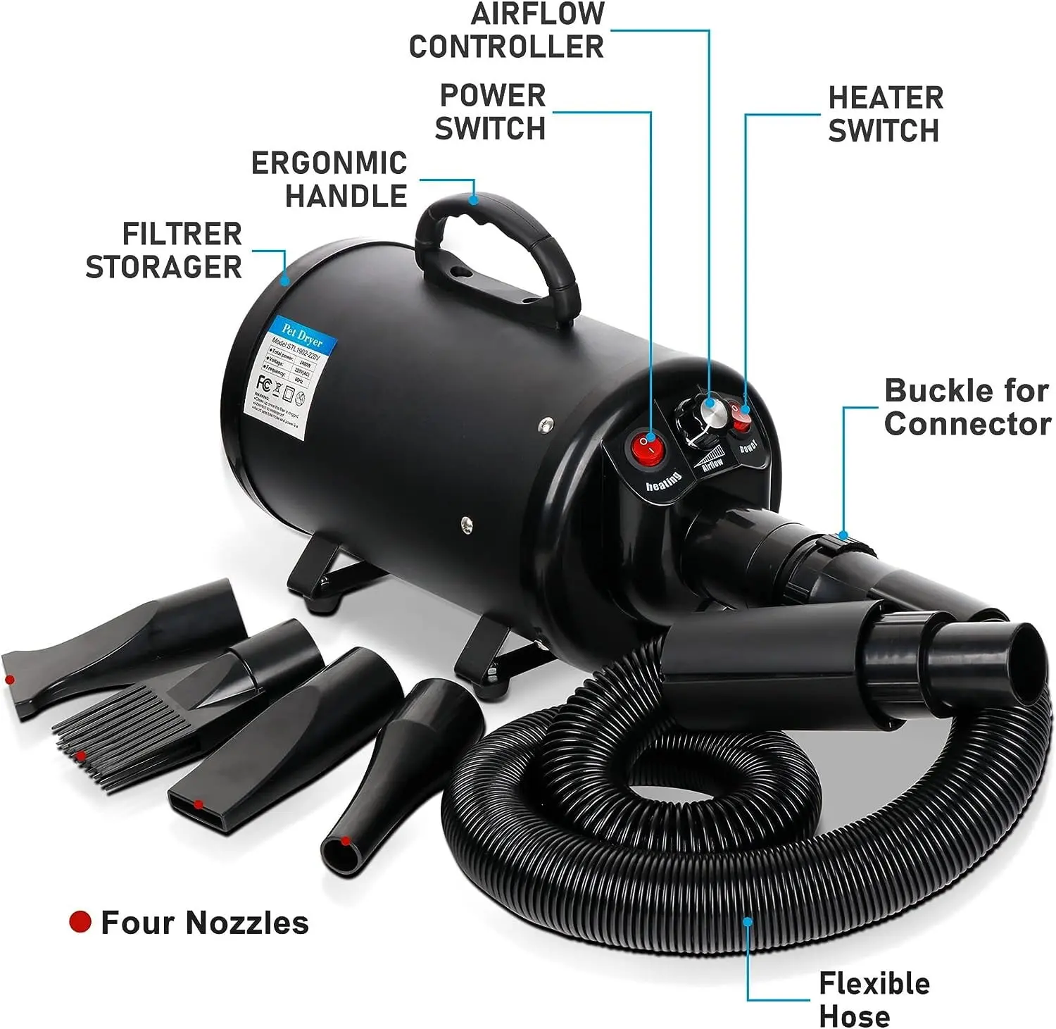 ·Warm Tip: For pets who are new to blower dryers, please kindly set the airflow to the low setting, let them slowly feel the air coming out of the nozzle and get used to the feel of the air and the noise.