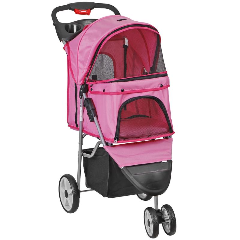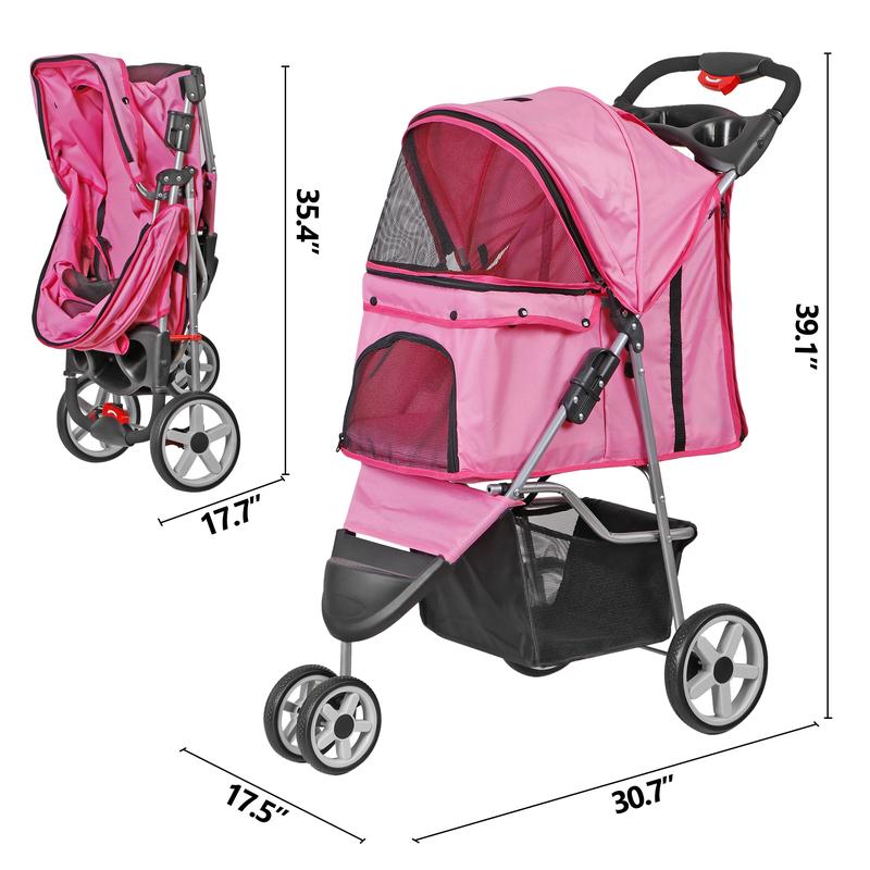Its sturdy stainless steel frame ensures stability up to 33lbs. This 3-wheeled pet stroller is well-structured with safety belts for a smooth ride and made of durable oxford cloth with a new function of water-repellent.