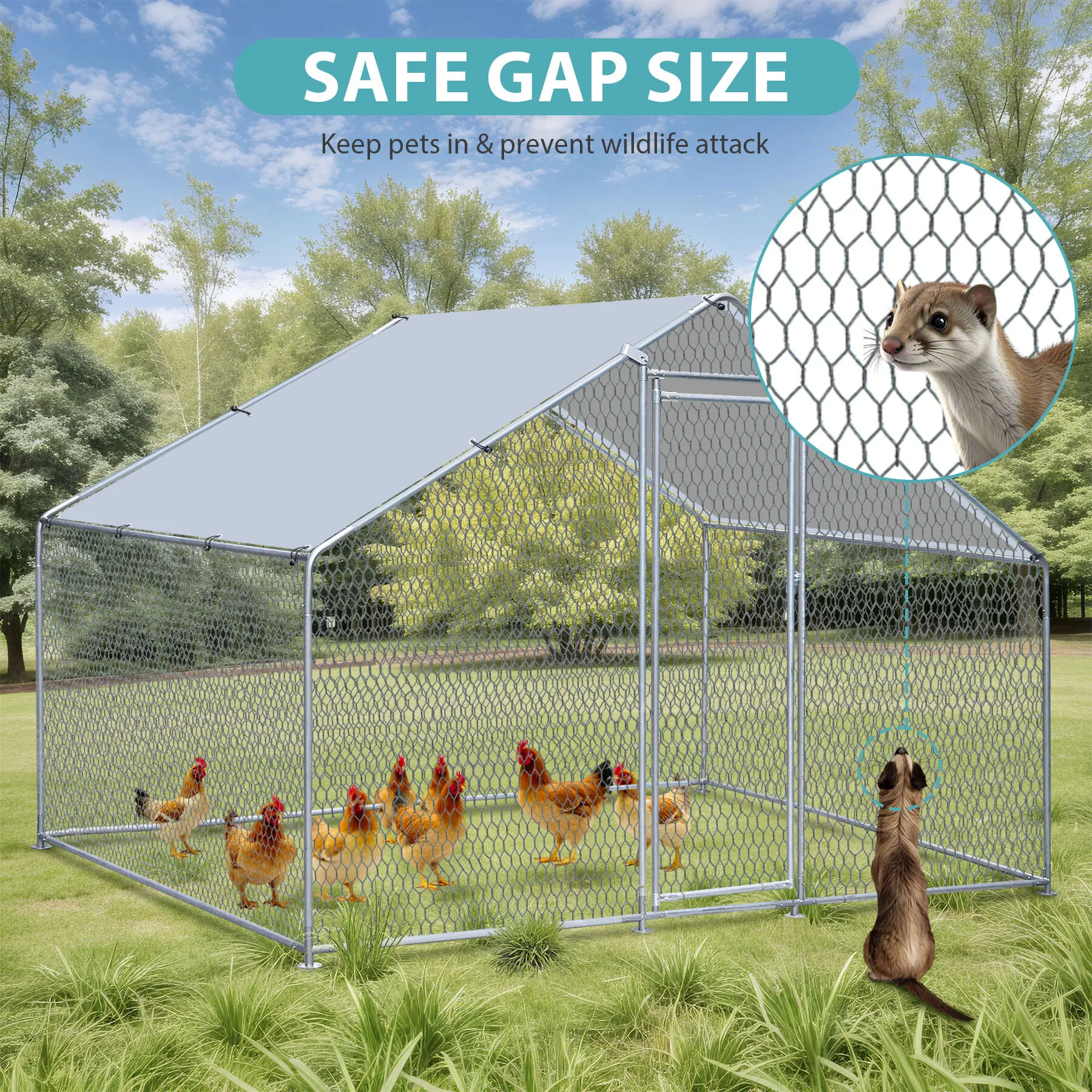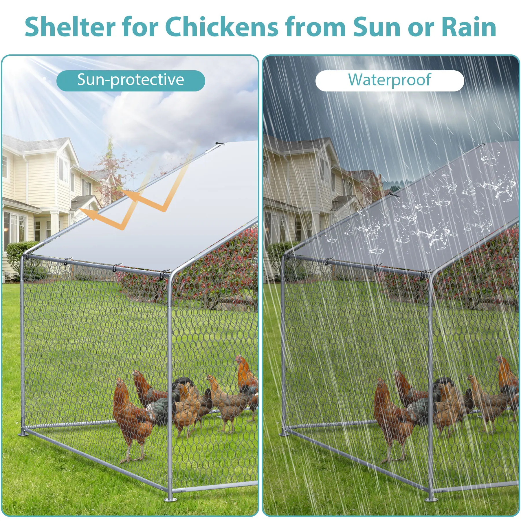 Durable Steel Structure: Constructed with a sturdy galvanized steel frame and 8mm thick tubing, the walk-in coop provides protection against rust and withstand outdoor elements, ensuring reliable performance over time. Not suitable for areas with frequent hurricanes.