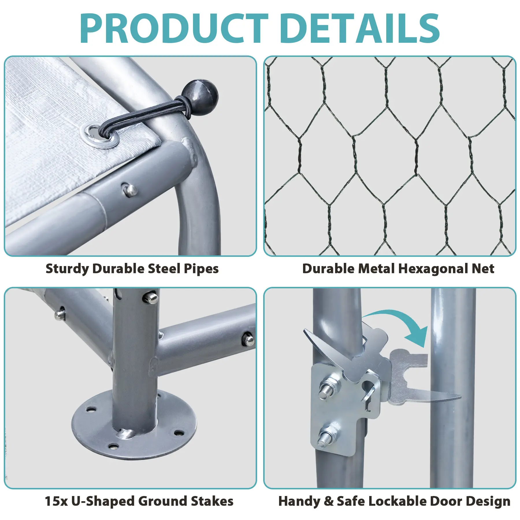 Safe & Secure: Perfect for backyard and farm use, the metal lockable door keeps chickens safely inside, preventing escape and making feeding and cleaning easy. Small mesh gaps increase safety by protecting them from predators while elastic cord and ground stakes provide extra stability.