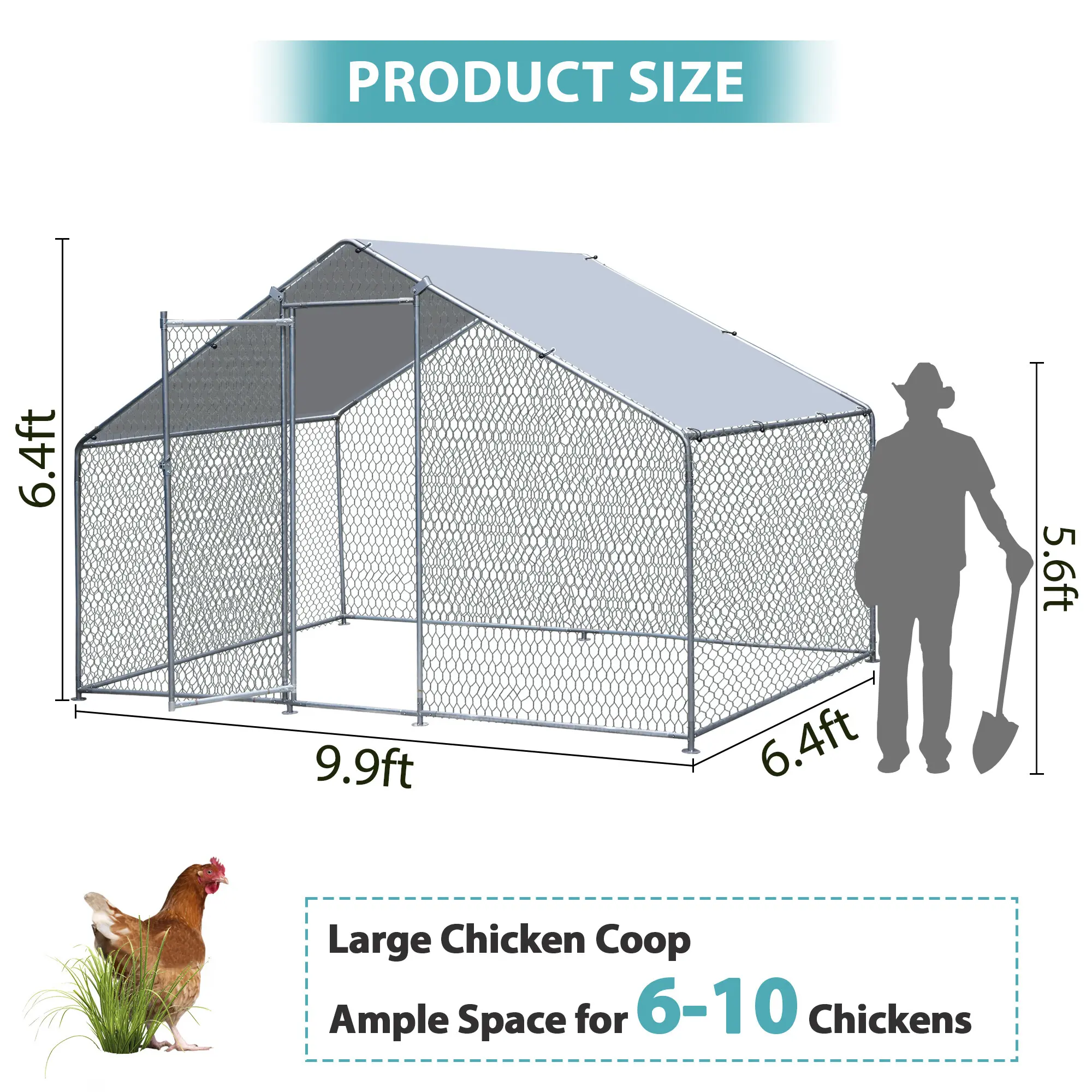 Large Chicken Coop: This 1 room coop size is 9.9’ L x 6.4’ W x 6.4’ H, providing ample space for you to walk around and comfortably house 6 to 10 chickens or other small animals like turkeys, rabbits, guinea pigs, ducks, and poultry.