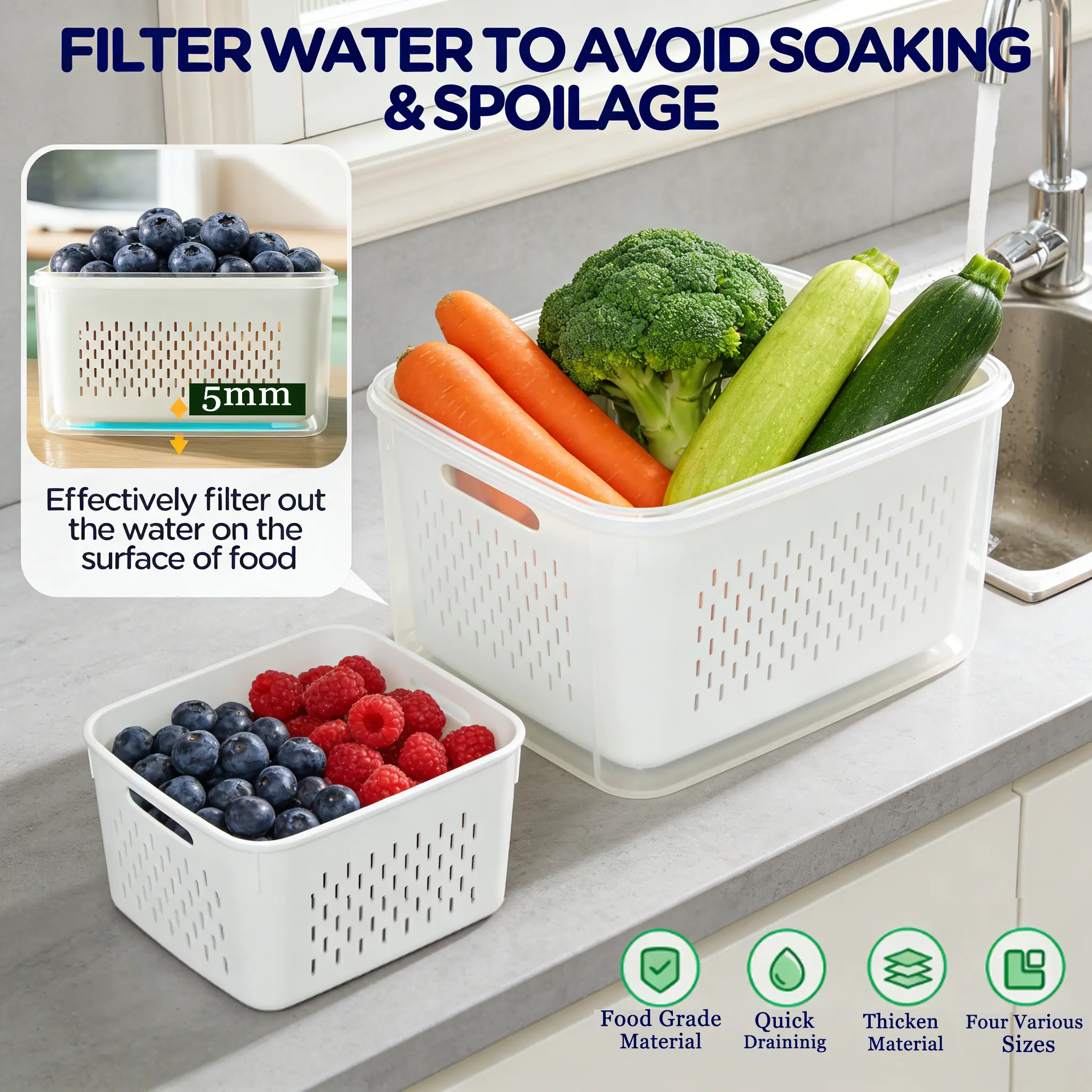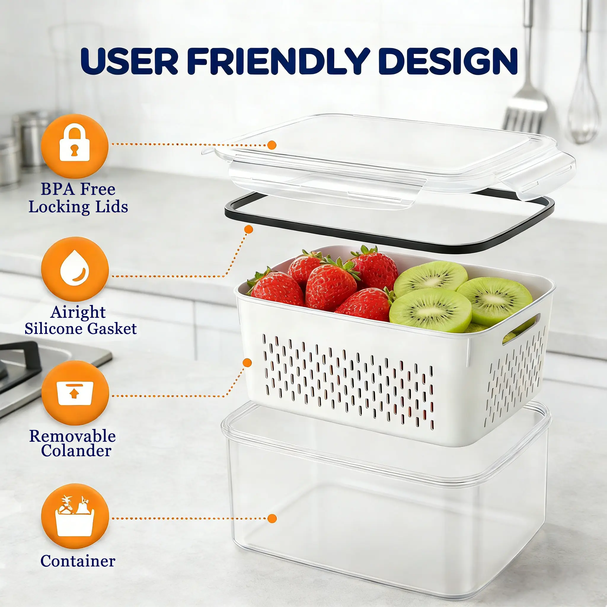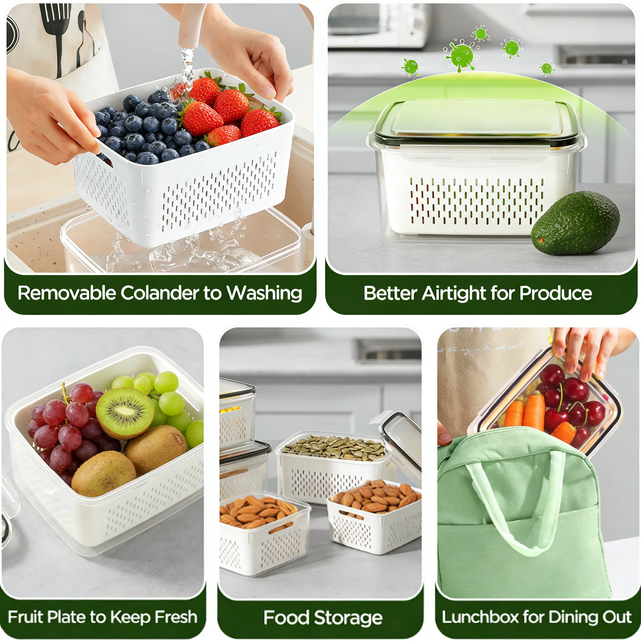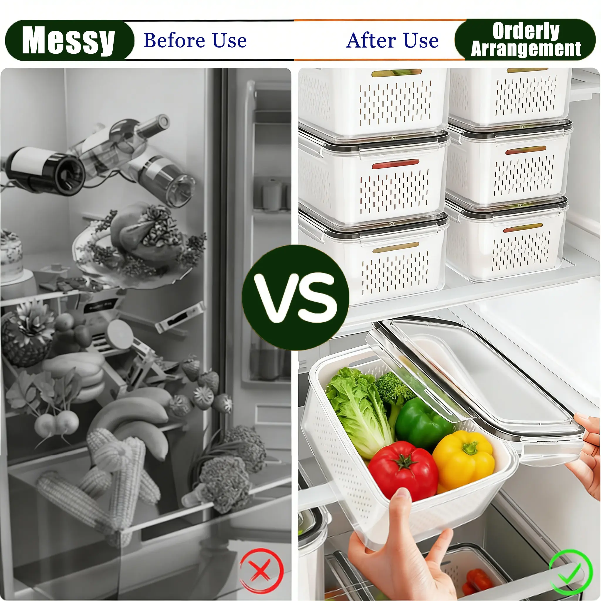 Airtight refrigerator organizer bins designed with silicone sealing rings and strong locking buckles help reduce moisture loss and slow down spoilage. The inner colander allows excess water to drain away, keeping produce crisp and fresh.