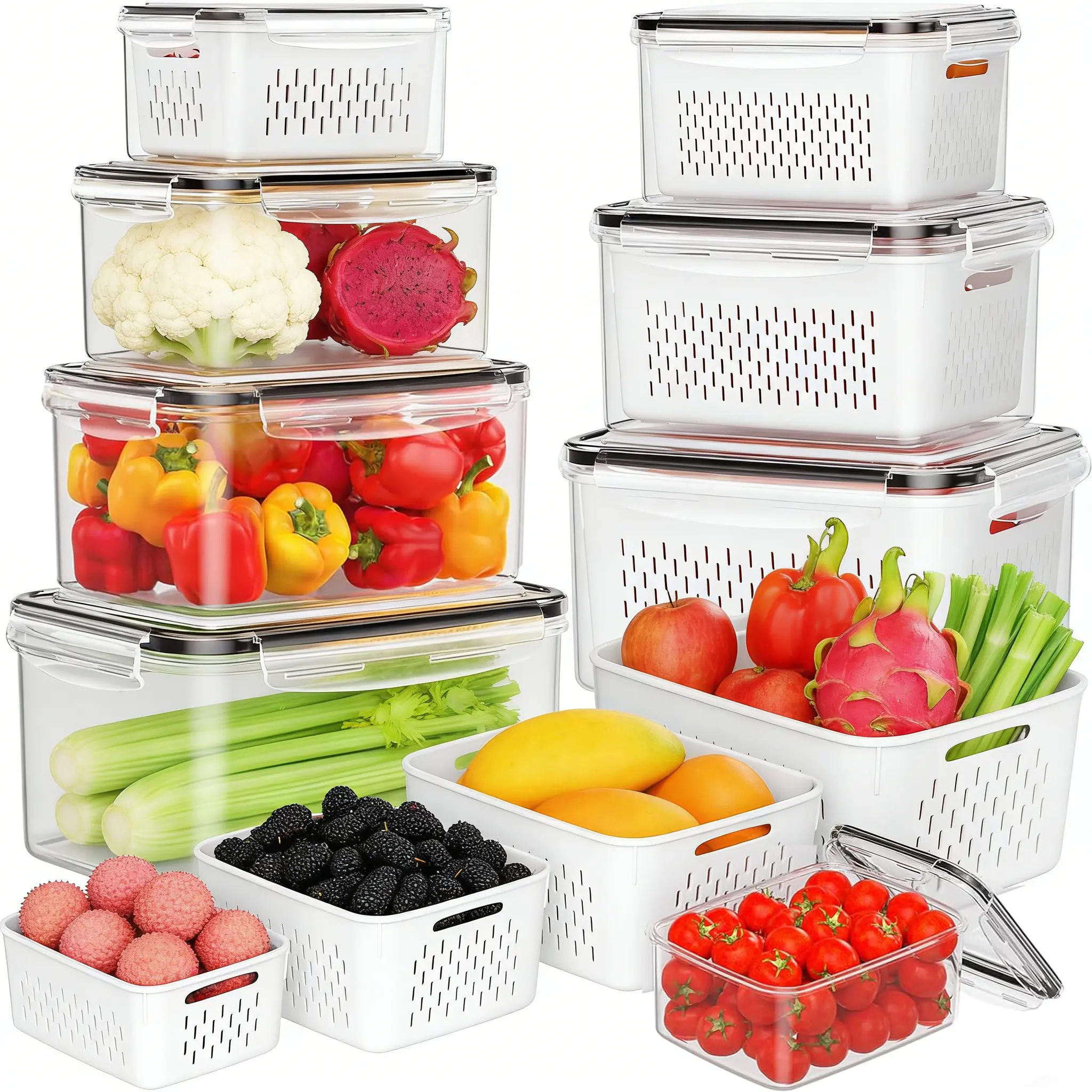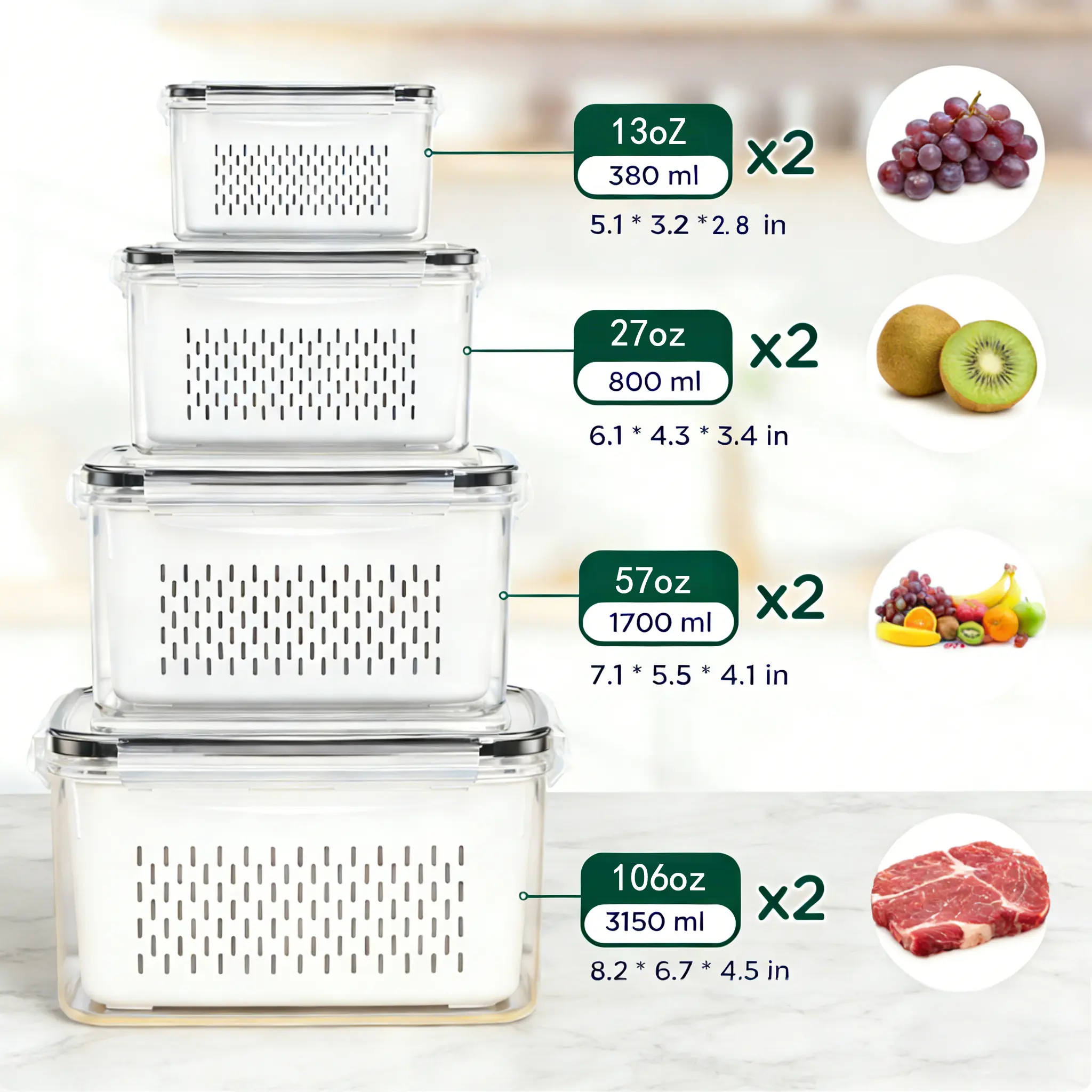 Includes 8 different-sized fridge storage containers with 8 removable colanders. Capacity ranges from 0.32 L to 2.7 L (0.34–2.85 qt). Perfect for storing berries, fruits, vegetables, meats, salads, and meal prep ingredients.