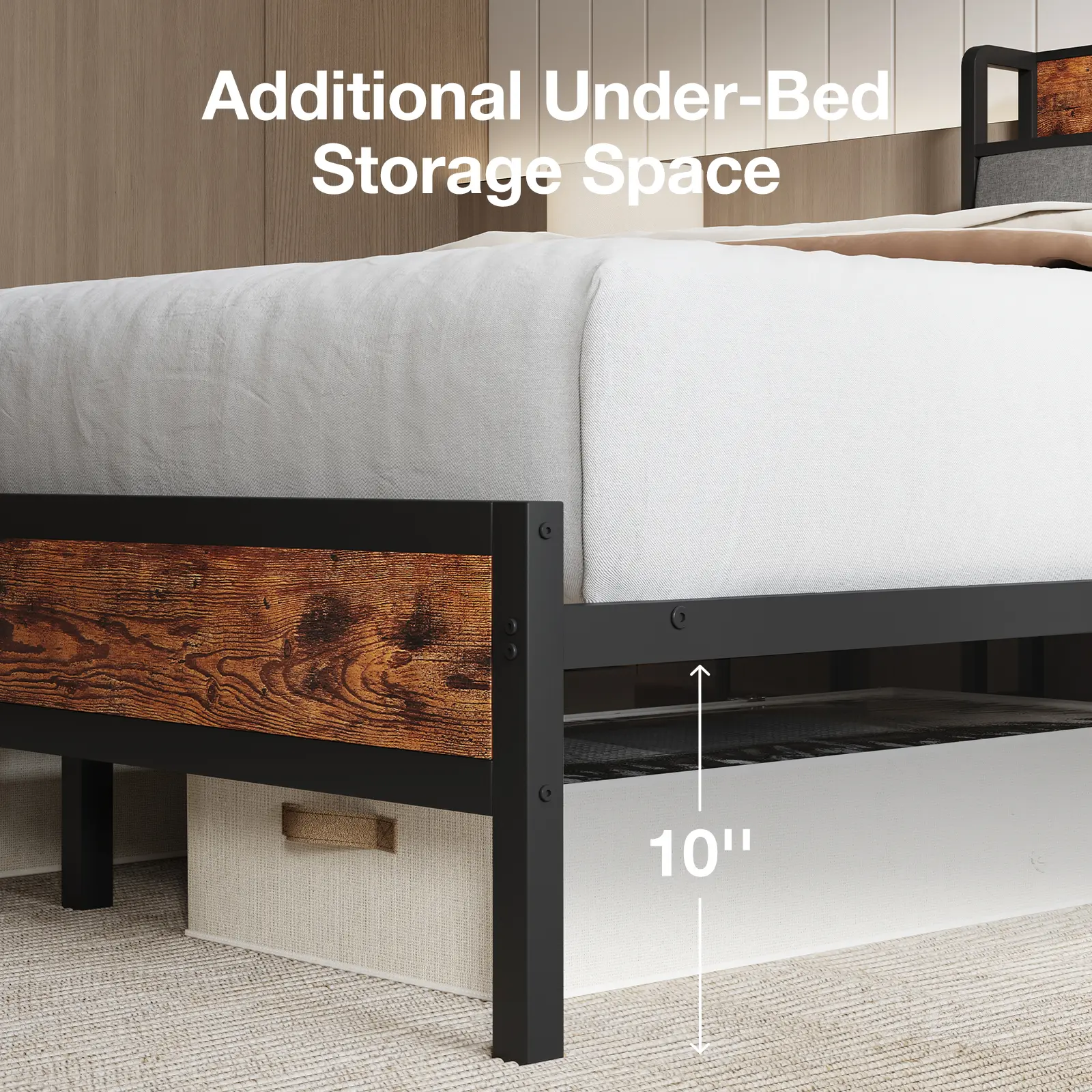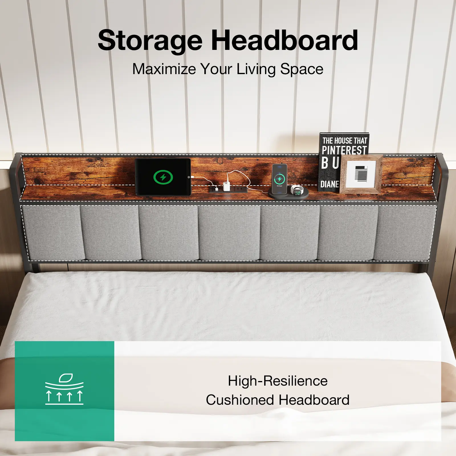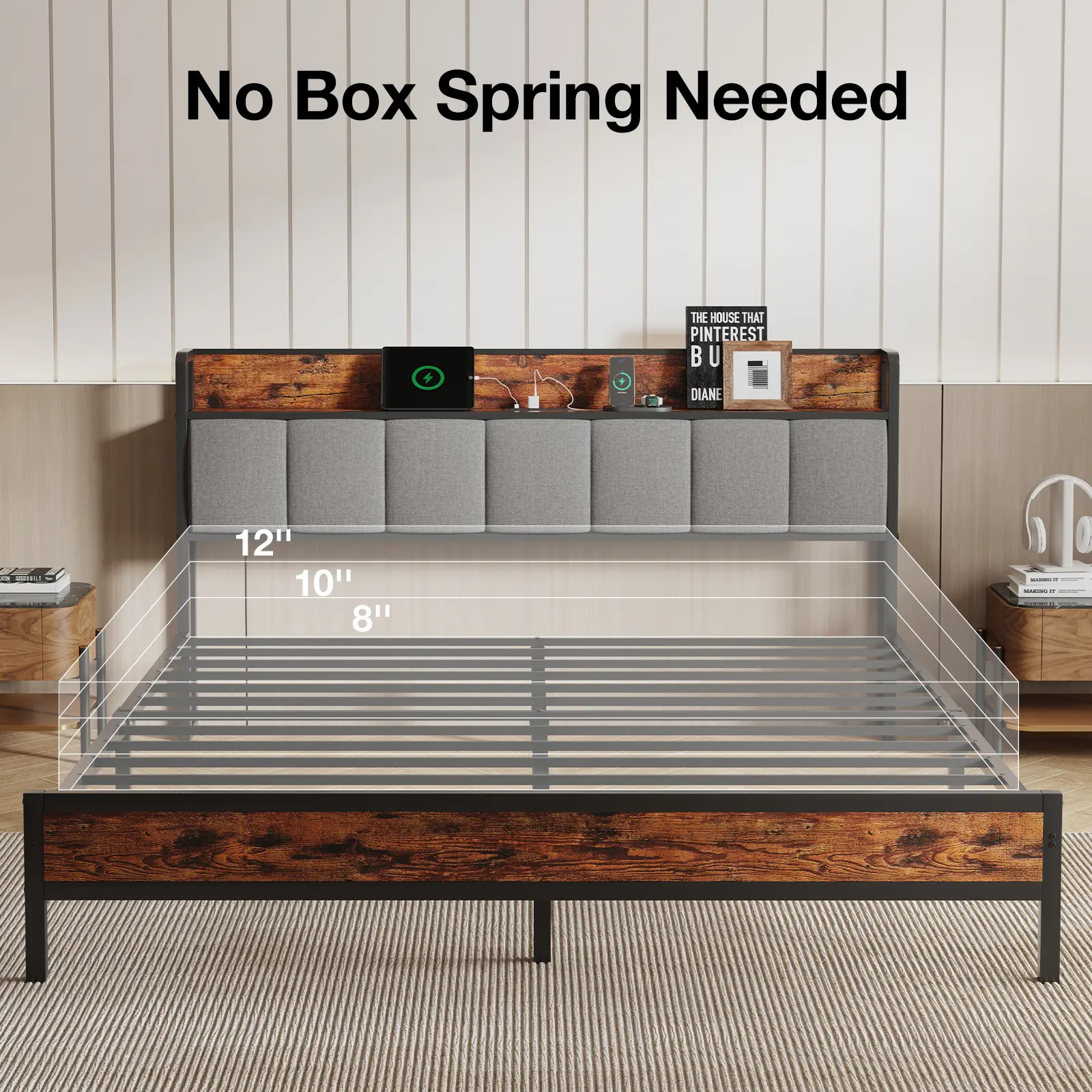 【Queen Bed Frame with Integrated Storage】Maximize your bedroom space with our innovative open-type storage headboard, offering the equivalent storage capacity of a bedside table. Keep your essentials like books, glasses, and remotes within arm's reach while maintaining a clutter-free environment. Perfect for small spaces or anyone seeking a sleek, organized bedroom.