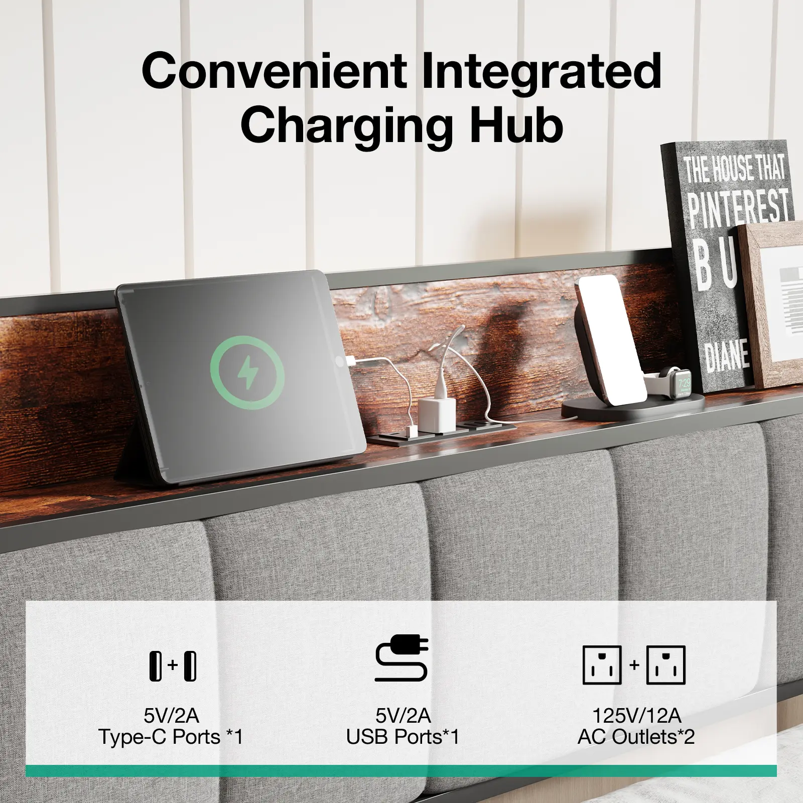 【Convenient 3-in-1 Charging Station】Stay connected with our built-in charging hub, featuring 2 AC outlets, 1 USB port, and 1 Type-C port. Charge your smartphone, tablet, or laptop directly from your bed without the need for extra adapters or extension cords—a modern solution for tech-savvy users who value convenience.