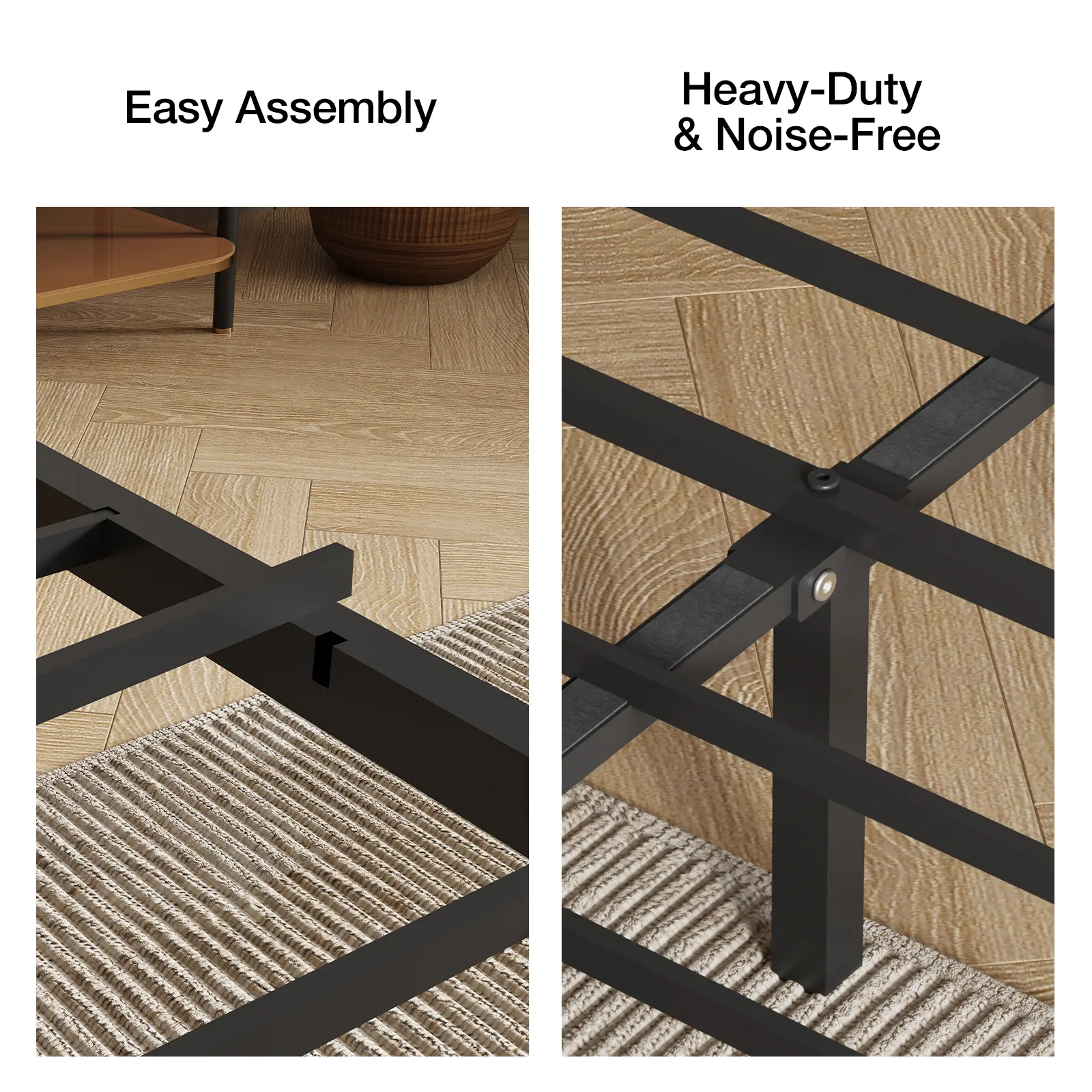 【Whisper-Quiet Design】Enjoy uninterrupted sleep with our advanced noise reduction technology. The bed frame features sound-dampening sponge strips on the central beam, rubber non-slip foot pads, and a reinforced structure to eliminate squeaks and creaks, providing a peaceful sleeping environment—perfect for light sleepers or shared bedrooms.