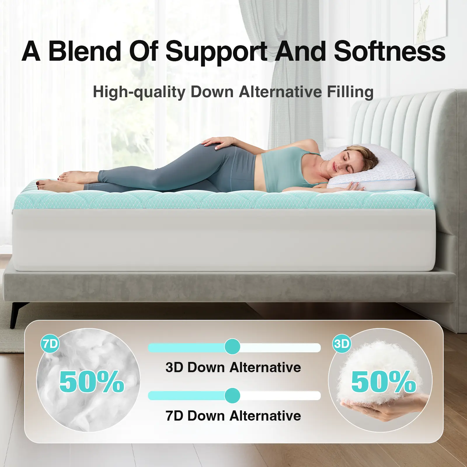 【High-Quality Filling】Queen size mattress pad is filled with premium down-alternative fibers, offering exceptional lightness and softness.Its enhanced resilience ensures it resists flattening even after extended use, and a simple fluff restores its original plushness. Featuring an innovative 50% 3D + 50% 7D blend,firm mattress topper combines cloud-like softness with reliable support, providing both comfort and durability for an outstanding sleep experience.