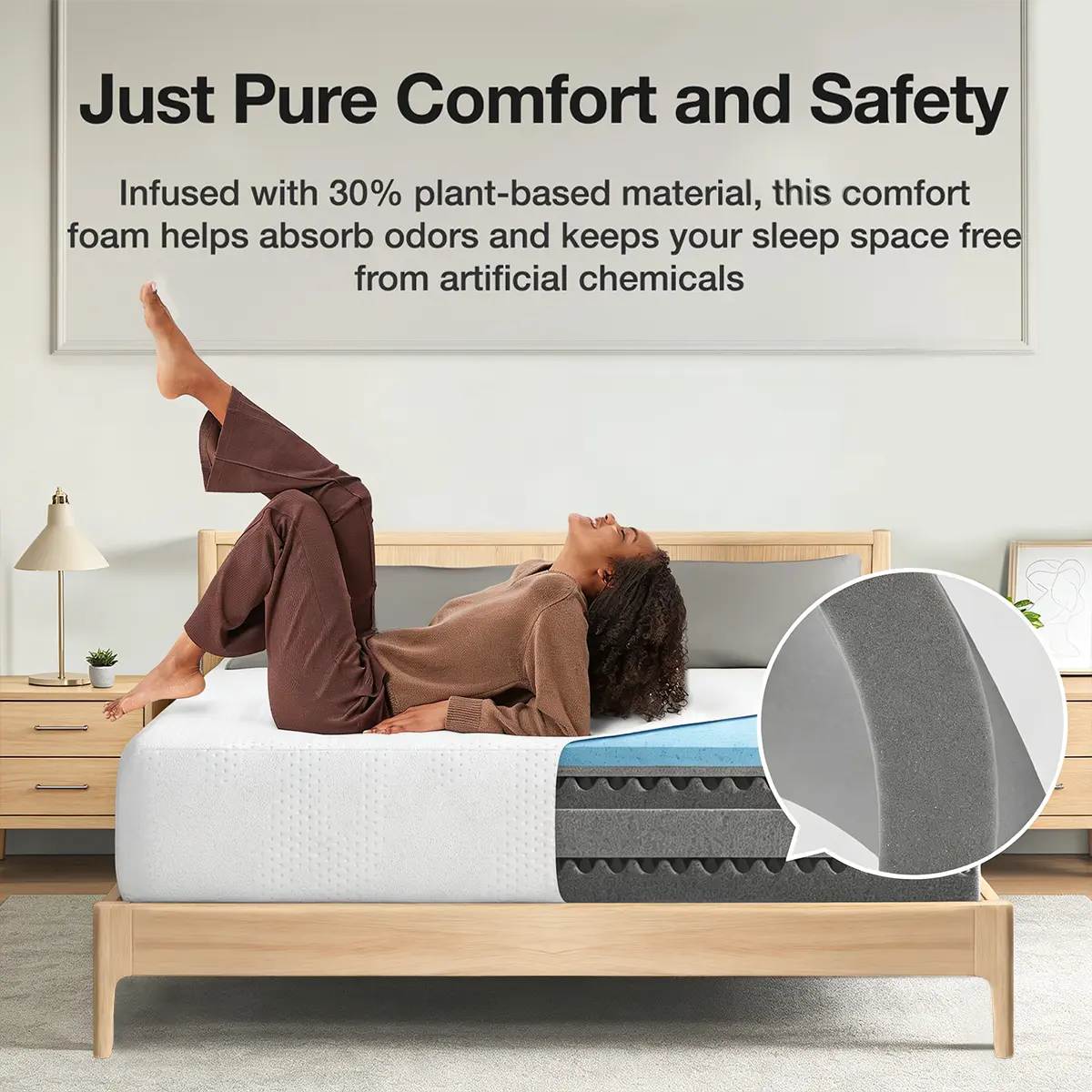 All-Night Freshness - This foam mattress is engineered with advanced foam technology that effectively absorbs odors and moisture. The wave-cut foam design enhances airflow, increasing breathability by 30%, thereby creating a dry, hygienic and comfortable sleeping environment. This allows you to experience refreshing sleep and wake up feeling rejuvenated.