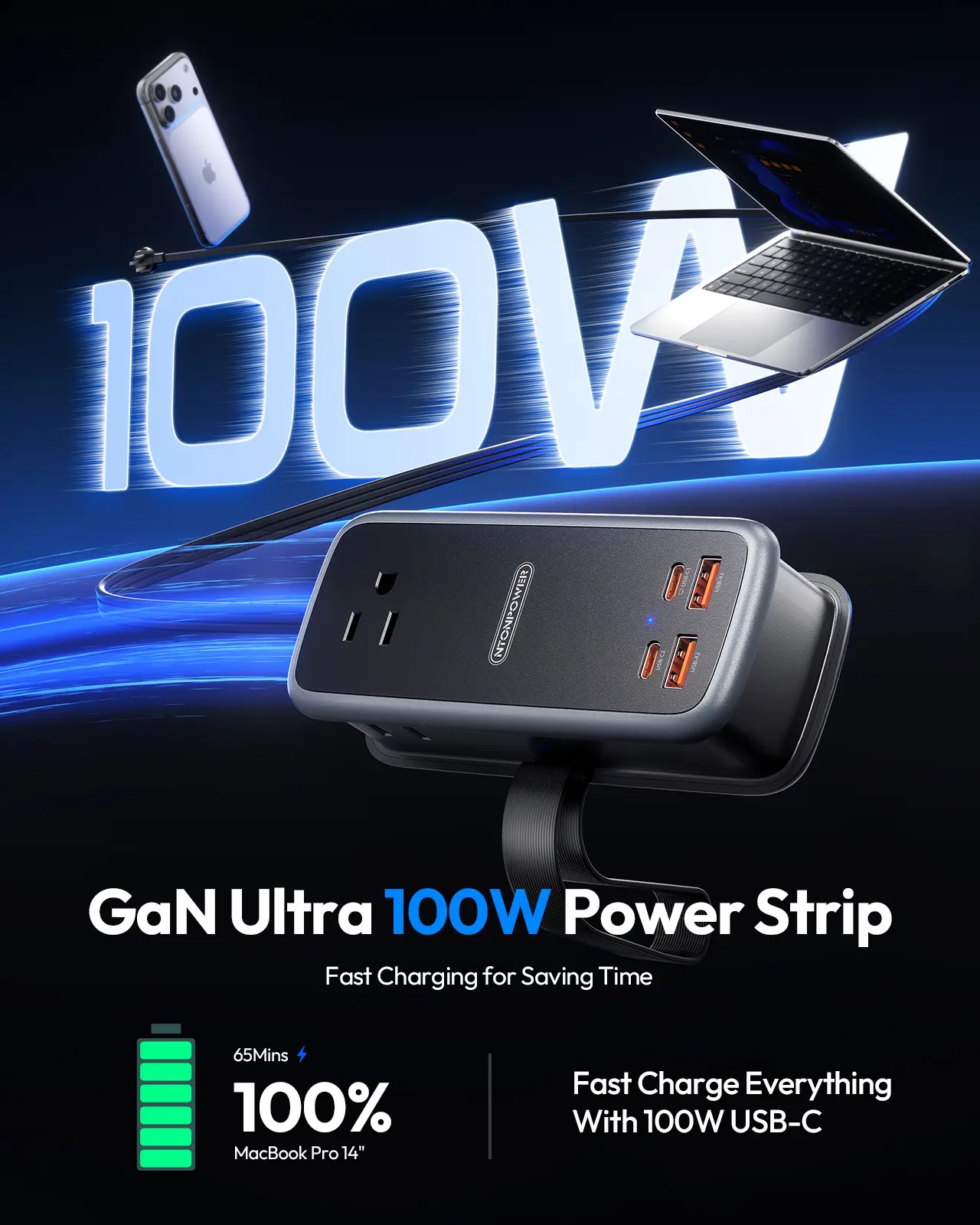 【GaN 100W PD Super Fast Charger】NTONPOWER power strip for MacBook Pro 50% in 30 Mins.This 100W GaN Fast Charging Station features 2 USB-C to rapidly charge your MacBook Pro, iPhone, and other devices simultaneously.GaN technology ensures cooler, more efficient charging. Intelligently distributes power for optimal speed.