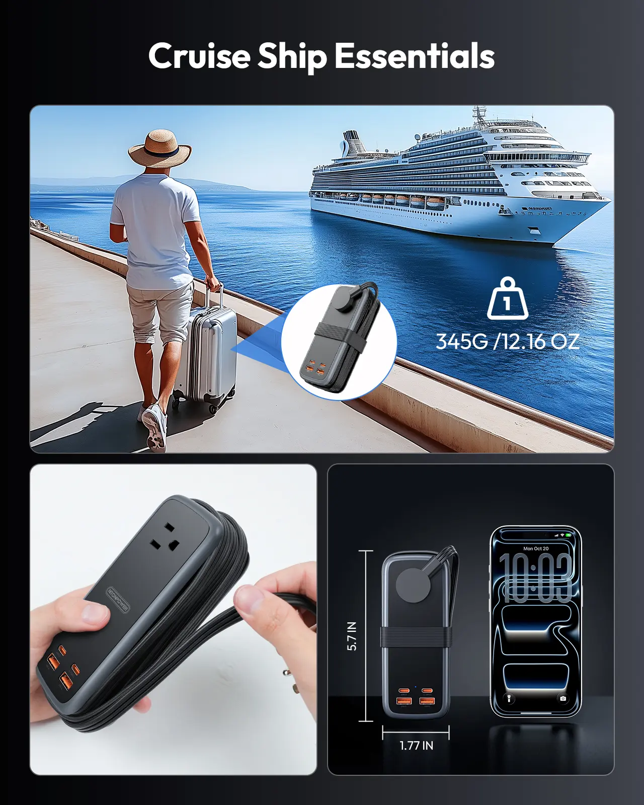 【Cruise Power Strip & Cruise Must Have】: pocket power strip is carry-on. the size is (5.7" x 1.96" x 1.77", 12.16oz). With 5ft Wrap Around Cord. and much more manageable in bags or luggage. The travel extension cord will become your great home essentials and travel accessories. NTONPOWER travel power strip no surge protection, it's a cruise essentials as cruise lines require that cruise approved power strip DO NOT have Surge Protection.