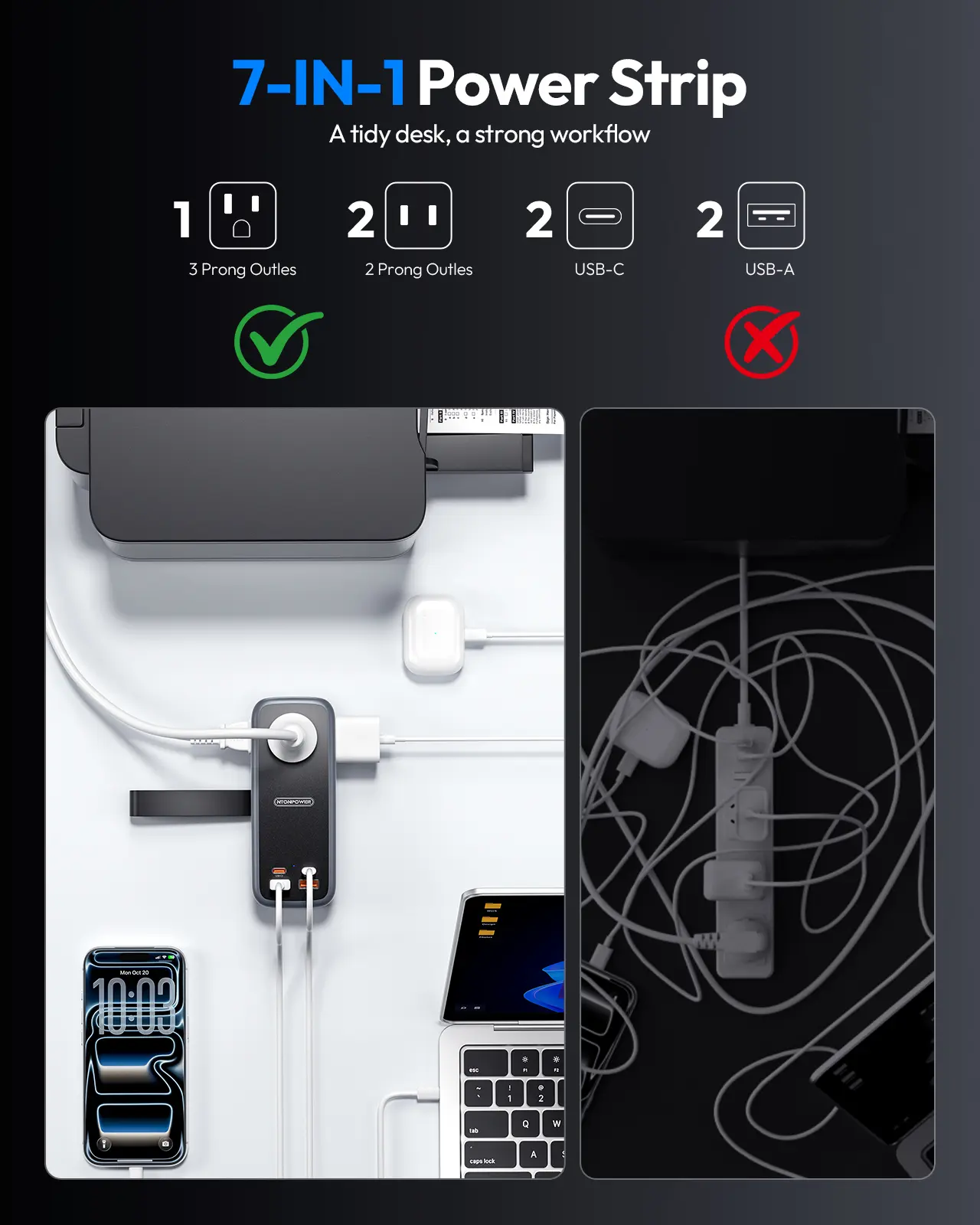 【100W 7-in-1 Charging station】 7-in-1 travel Power Strip your charging with this 100W all-in-one. Equipped with 3 AC outlets(1 grounded, 2 two-prong) and 4 USB(2 USB-C, 2 USB-A)ports, The built-in 5ft extension cord offers flexible placement, while the compact, lConquer cord chaos and charge everything from laptops to phones with ease. The ultimate travel and office power strip.