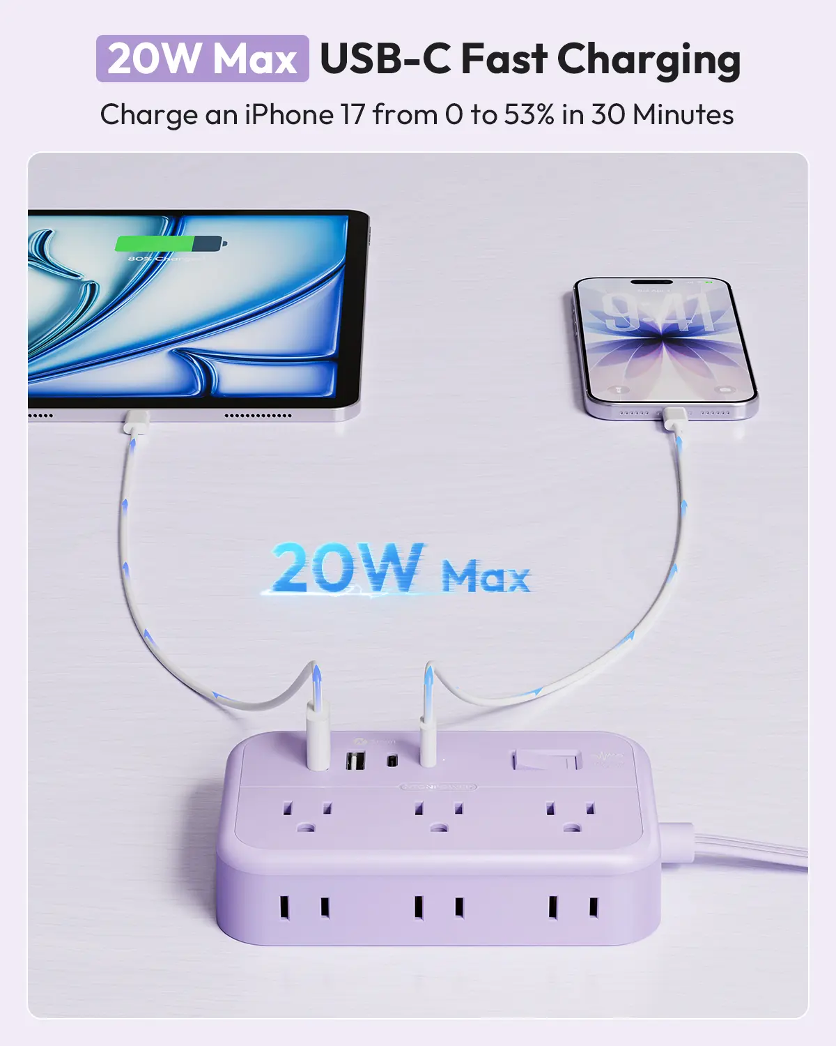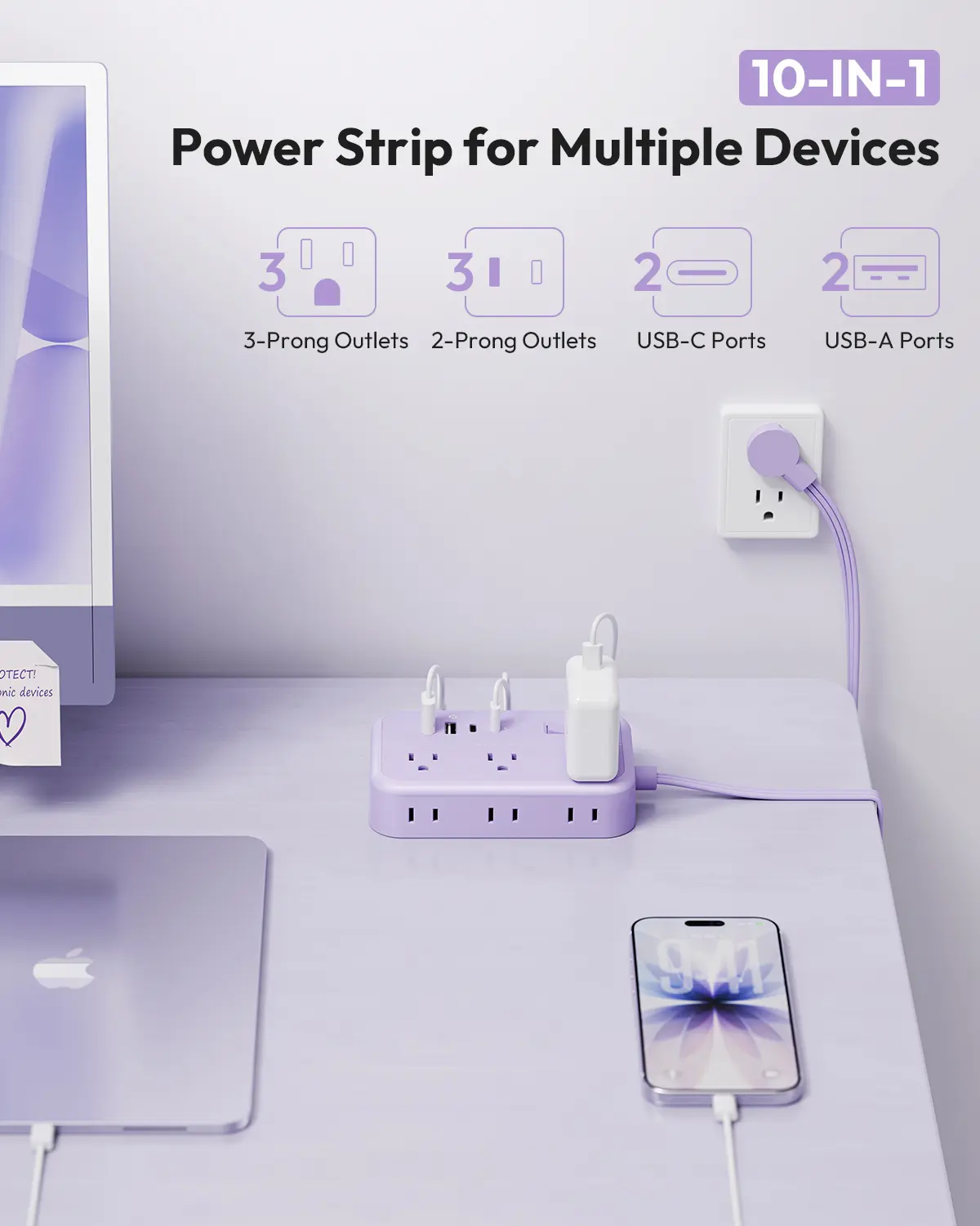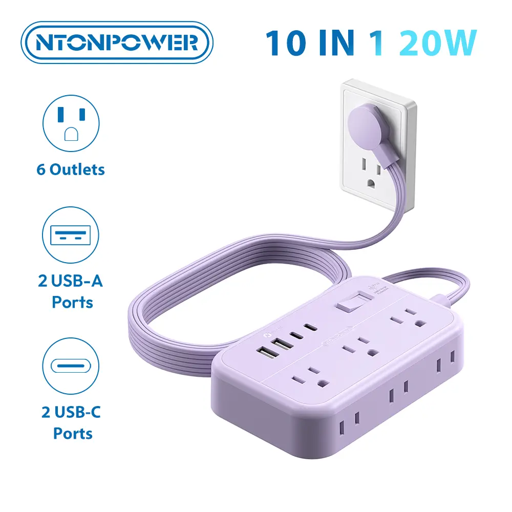 【 Charge Everything, Fast】 This isn‘t just another power strip. It’s your command center for 10 devices. Power up your laptop, monitor, lamp, AND simultaneously fast-charge your phone, tablet, and earbuds. The 20W USB-C port delivers a rapid boost to your devices, so you spend less time plugged in and more time on the go