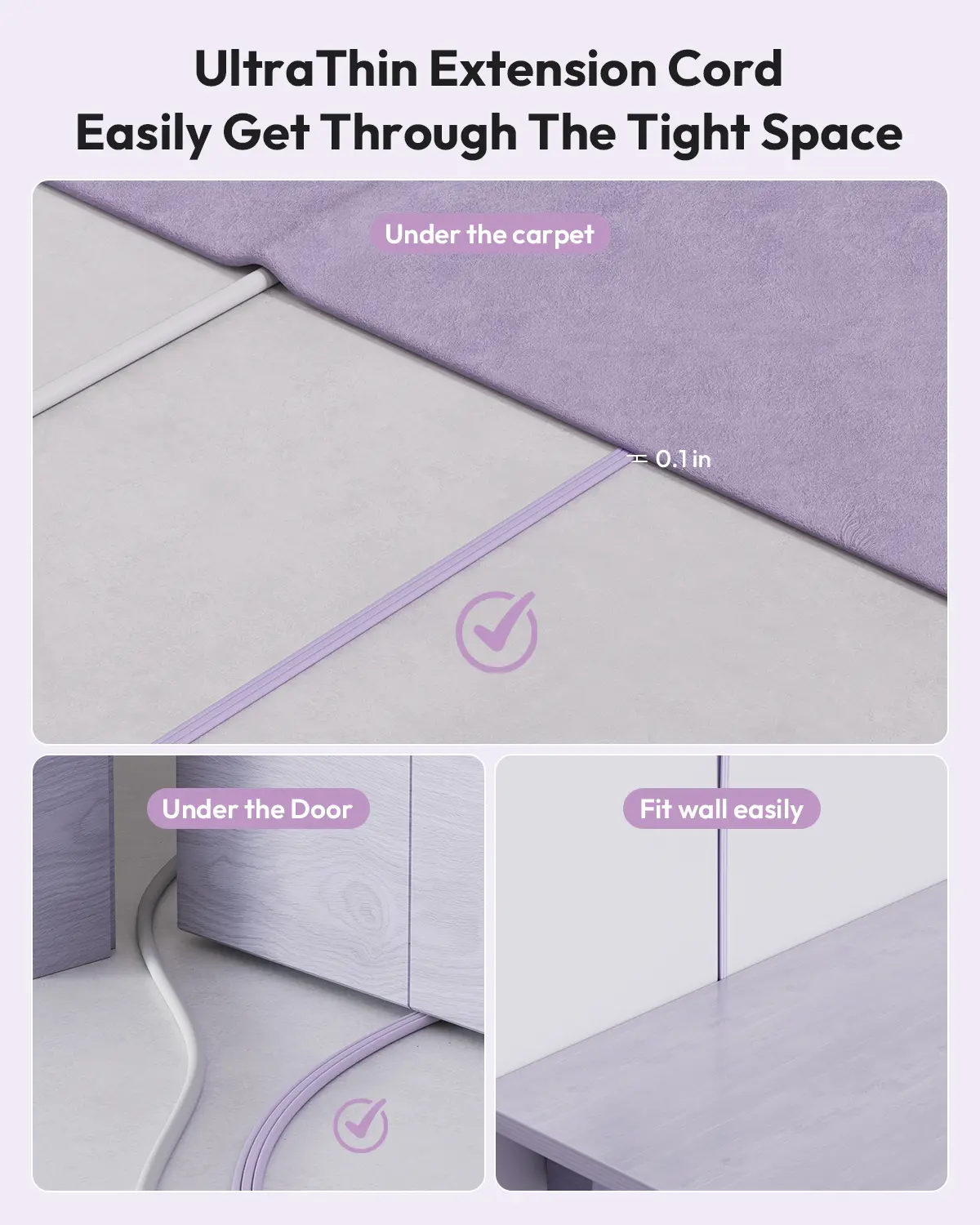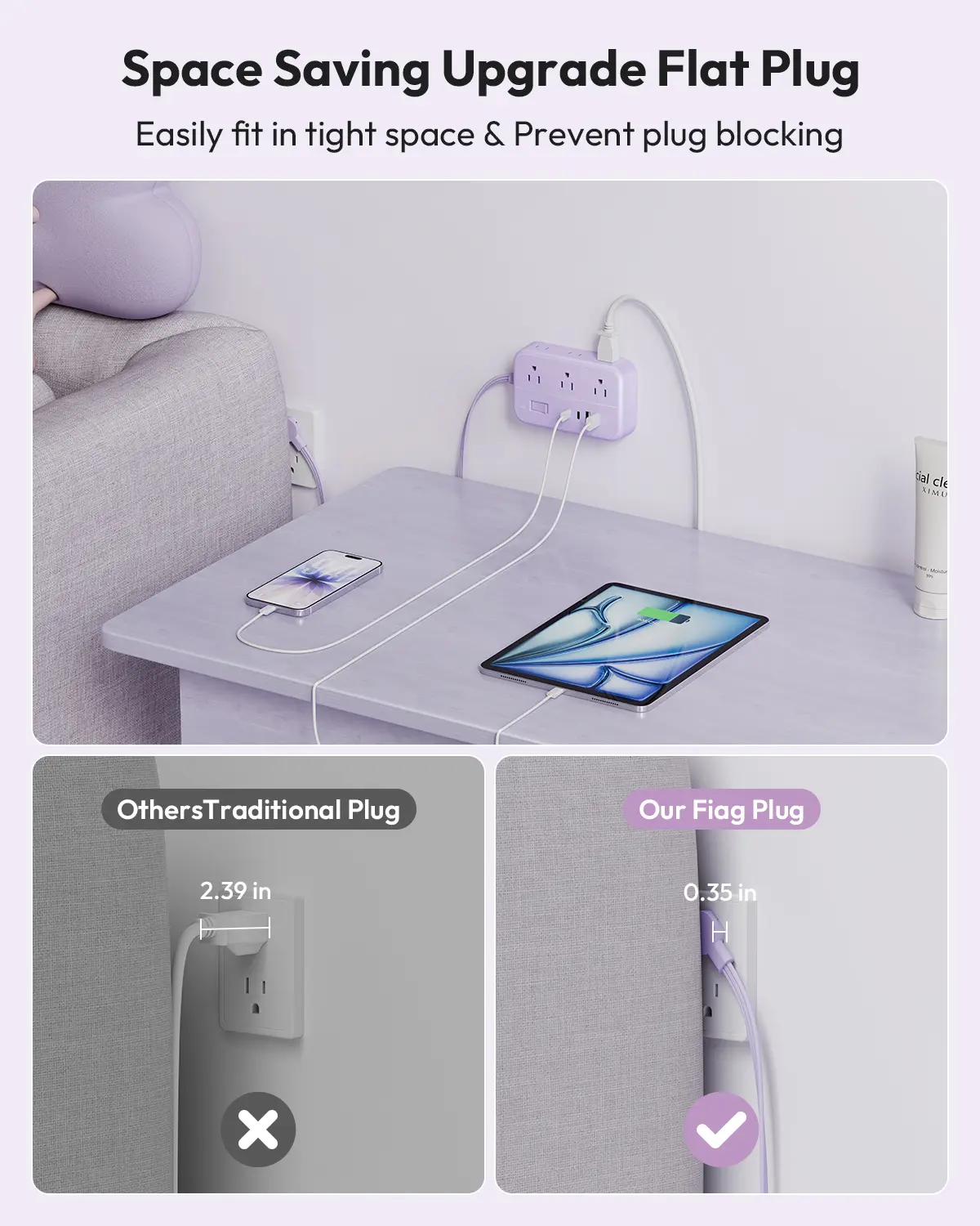 Forget bulky plugs that block adjacent outlets! Our ultra-slim flat plug (0.35) is 6X thinner than traditional ones. It slides seamlessly behind sofas, nightstands, or tight furniture spaces, turning dead zones into usable power