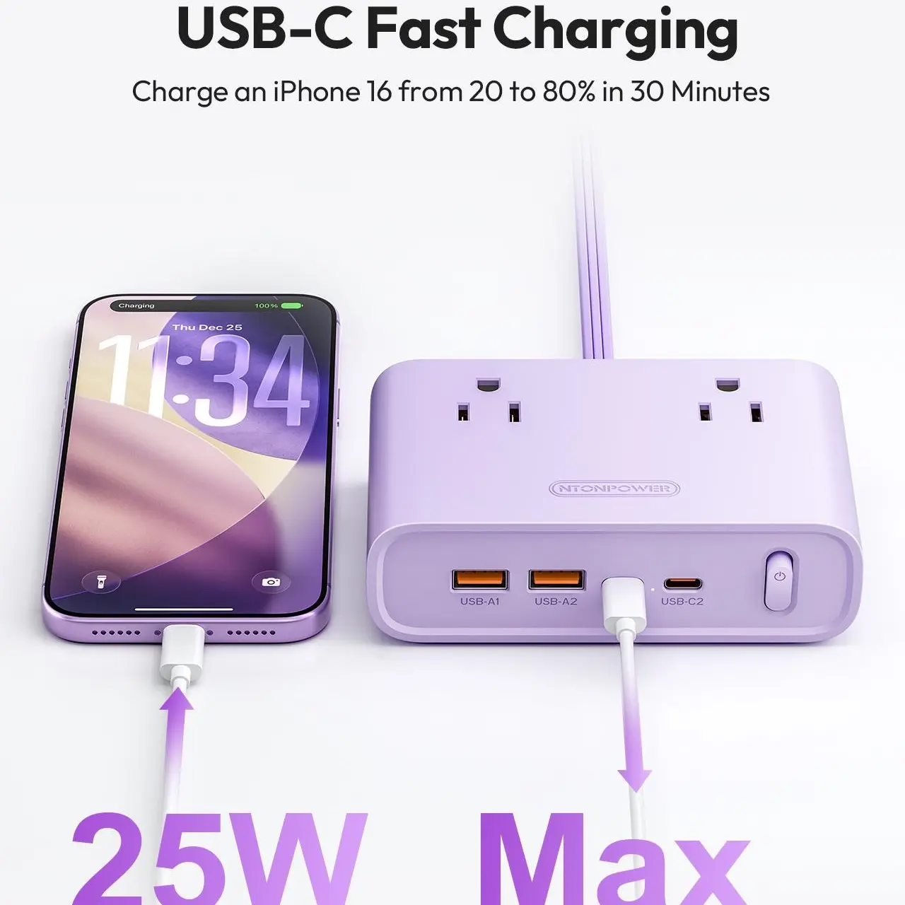 ·Dual USB-C ports deliver up to 25W fast charging, 3 times faster than 15.5W strips.