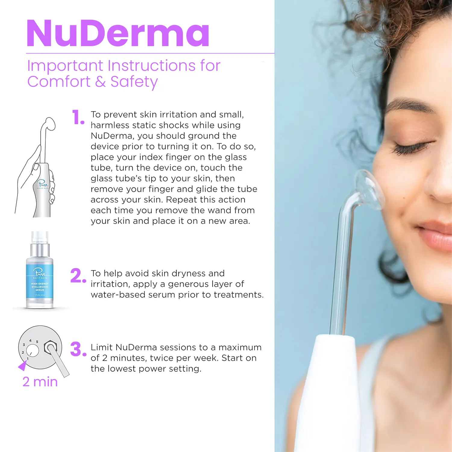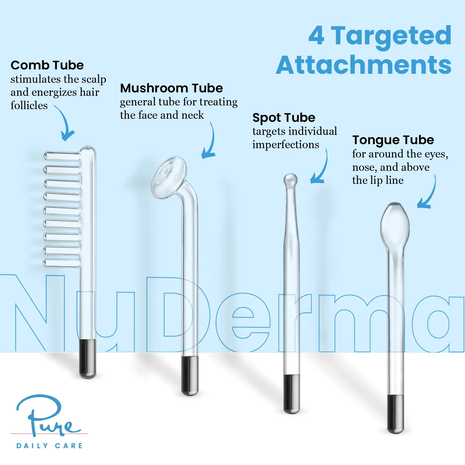NuDerma Anti-Aging with Neon Gas: NuDerma with Neon attachments delivers mild electrical currents that promote microcirculation, which stimulates collagen production to smooth fine lines, reduce wrinkles, and firm the skin. Ideal for those seeking a youthful glow, it revitalizes your complexion while enhancing skin tone and texture.