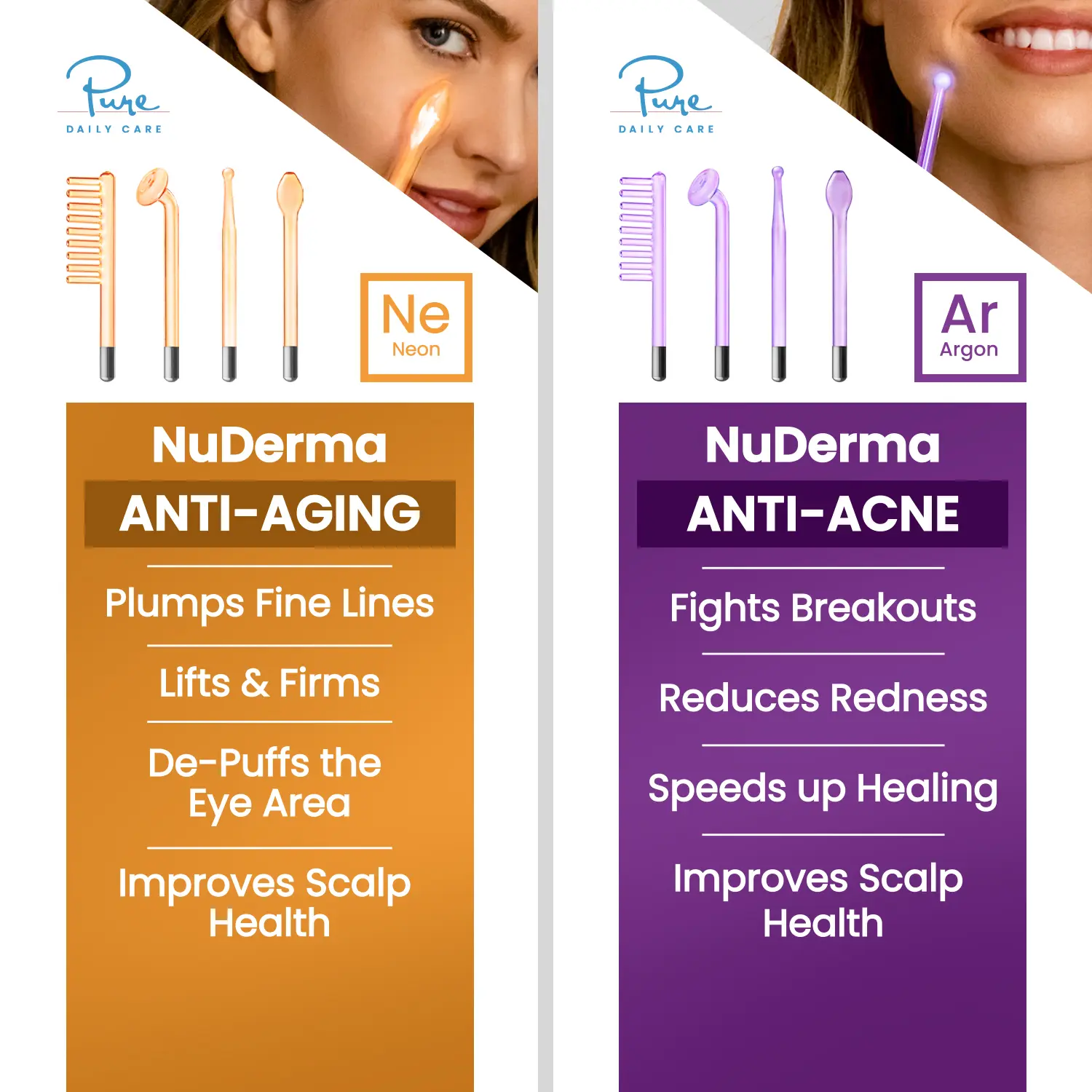 NuDerma Anti-Acne with Argon Gas: NuDerma with Argon attachments delivers oxygen-enriched molecules to the skin, targeting acne-causing bacteria and reducing breakouts and inflammation. Its deep-cleansing action accelerates healing, leaving your skin clearer and blemish-free.