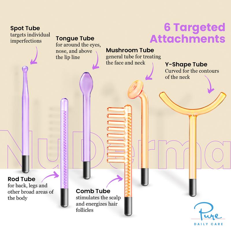 Boost Your Skin with Argon & Neon – Winner of the Cosmopolitan 2023 "Holy Grail" Awards. The NuDerma Professional Skin Therapy Wand comes with a total of 6 beauty wands, including 3 brand new Argon-powered applicators and applicators supercharged with Tungsten for enhanced effectiveness. Harness the natural healing power of Argon and Neon high frequency to elevate your overall skin profile.