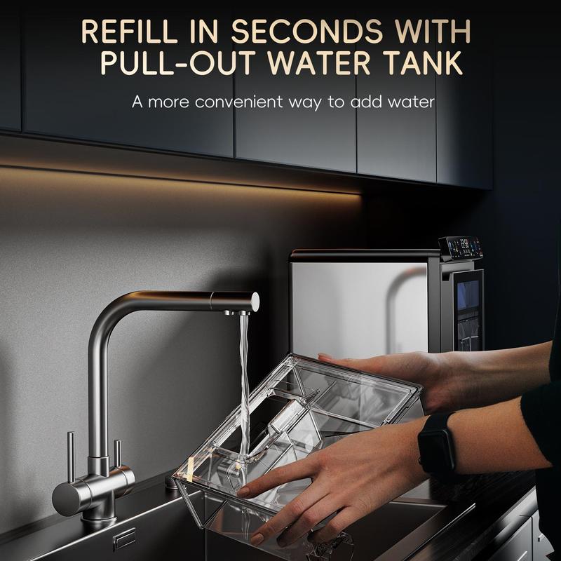 ·Simplify Water Refills & Ice Access: Pull-out water tank streamlines refills and cleaning. Easily remove the basket to transfer ice without mess or hassle