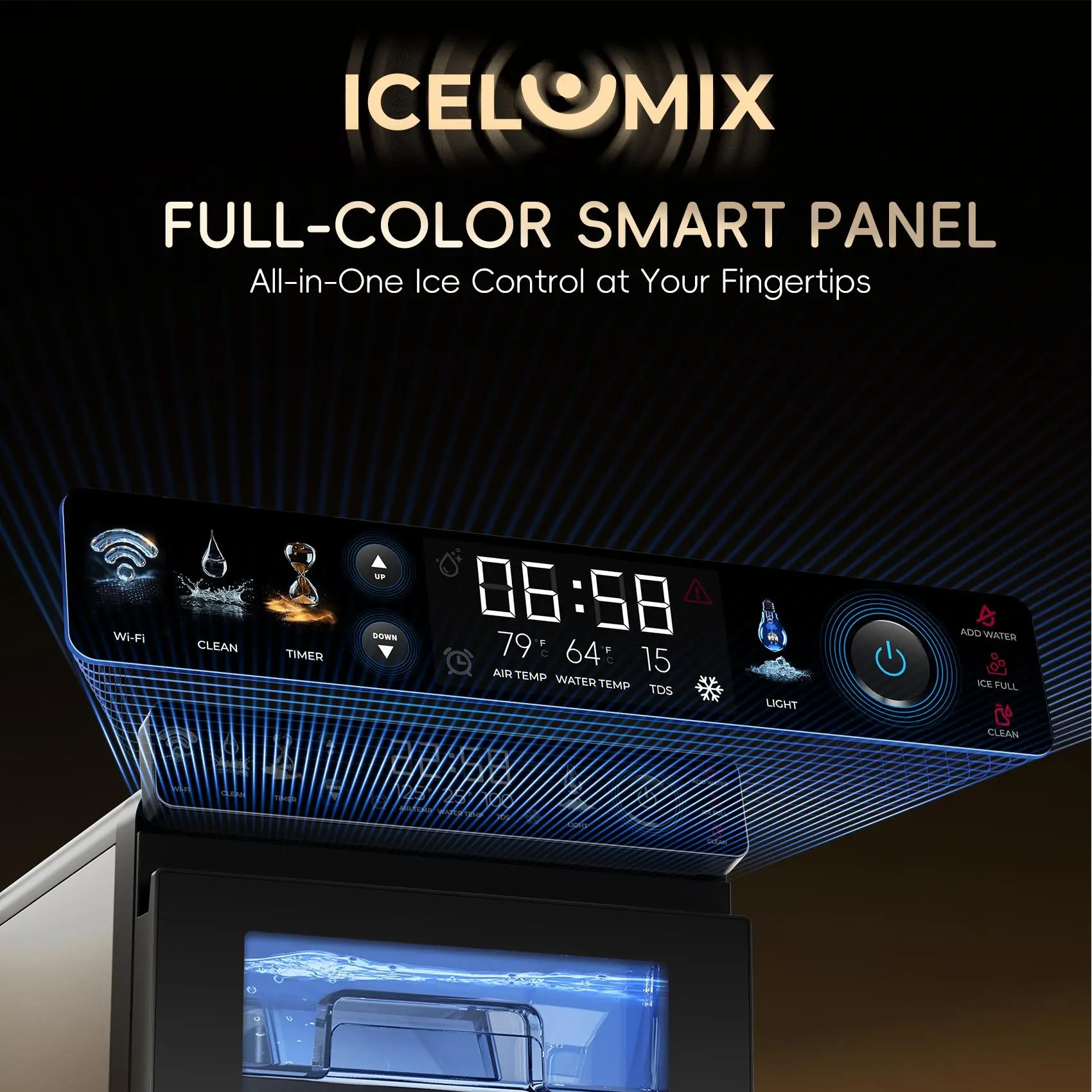 ·IceLumix Full-Color Panel: Industry-first display with vibrant icons, real-time TDS and temperature. Smarter control, clearer visuals—ice-making has never looked this good