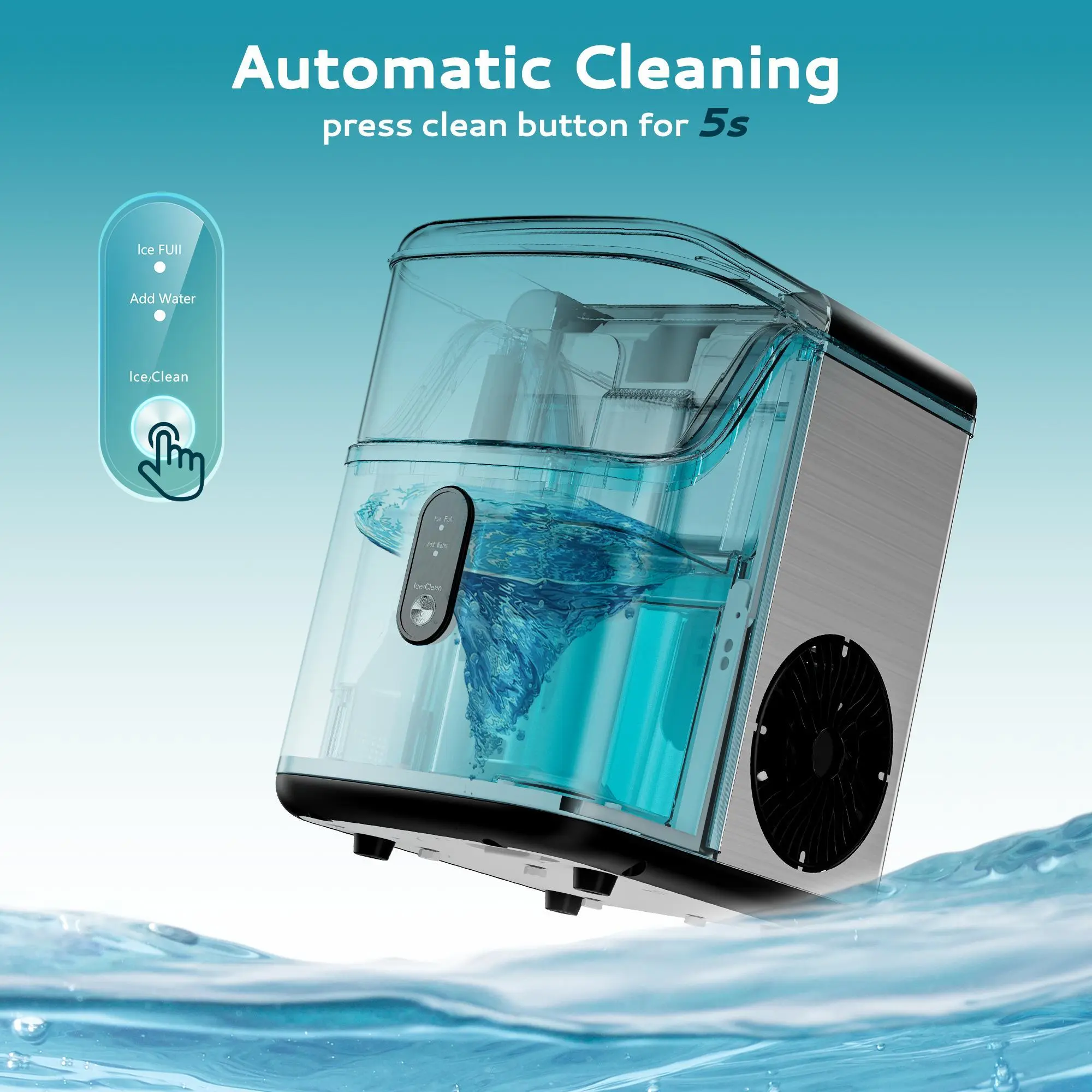 【Automatic Cleaning】: Thanks to the Automatic cleaning system built into the nugget countertop ice maker, you can easily skip the procedure of scrubbing, press the "CLEAN" button for about 5s, and the cleaning program of the pebble ice maker will be activated, no more tedious manual cleaning with the self-cleaning function.