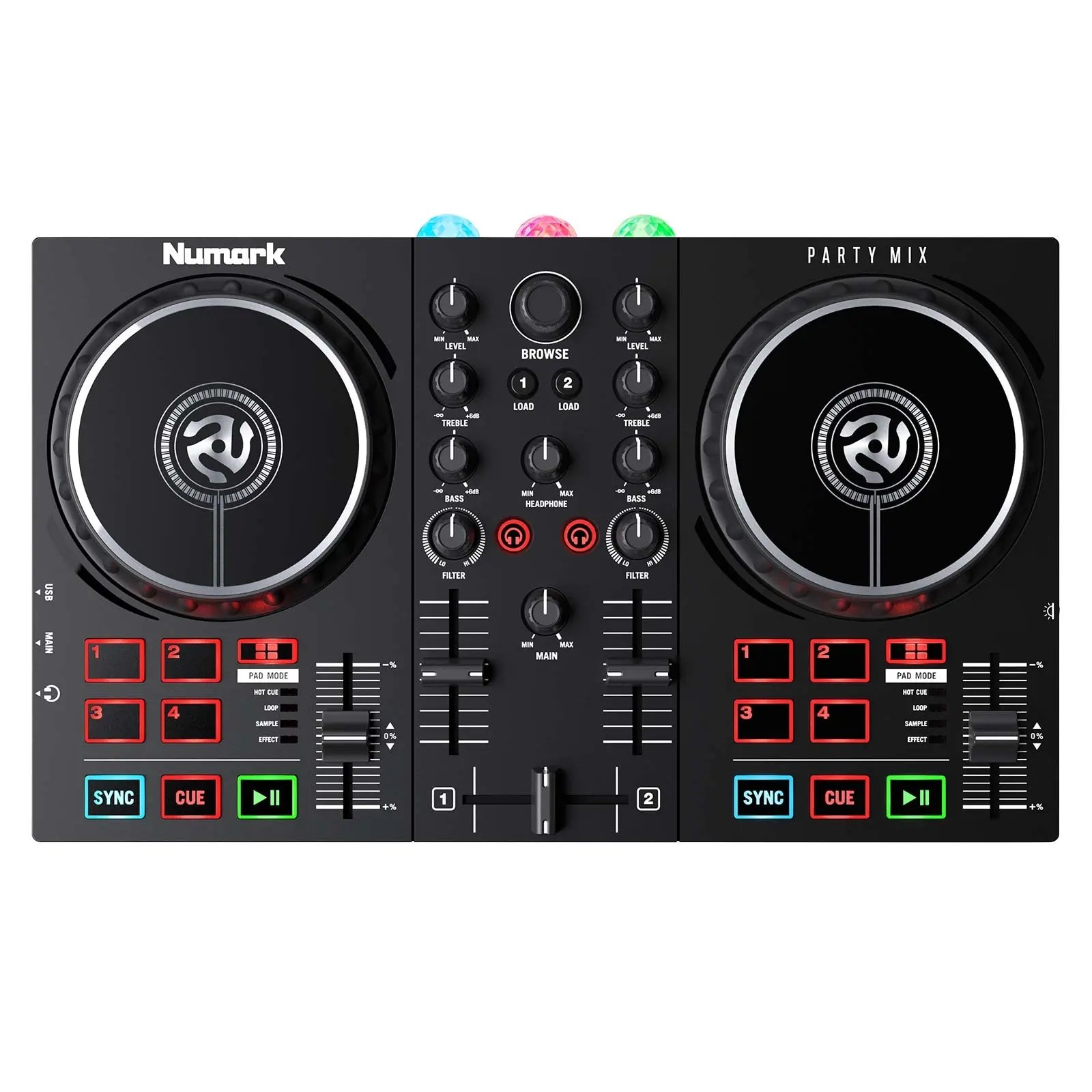 The original Party Mix is a best seller for a reason. It's packed with all DJ performance essentials, it's super fun and it includes a dazzling DJ lighting display that must be seen to be believed. The Party Mix II takes this legacy to the next level with even more pro-grade features added to the mix. Simply plug in your laptop or mobile device and start mixing your ultimate party playlist. The latest music is always on deck. With Party Mix II, you don't need a huge music library to start DJing. Featuring seamless integration with Serato DJ Lite software, access your existing library or get on-demand access to mainstream streaming services including TIDAL, Beatport Link, Beatsource Link, and SoundCloud GO - whatever your party's vibe, you can be sure the hottest tracks are available at your fingertips to create your custom party playlist. If you'd rather bring a phone or tablet to the party, Party Mix II is also compatible with popular DJ mobile apps like djay PRO AI by Algoriddim. Simply connect your mobile device to Party Mix II with a USB camera connection kit (sold separately) and you're set. Setting the ultimate party atmosphere doesn't get easier than this. Party Mix II features three multi-colored LEDs with wide-coverage lenses for a room-filling, beat-synchronized light show. With 5 lighting modes to choose from, finding the right vibe for your party is a snap.Party Mix II is packed with pro-grade features to handle virtually any party. The 1/8-inch main audio output allows you to hook up external speakers while still monitoring the mix with the 1/8-inch headphone output connection. Four performance pads on each deck allow quick access to cue points, loops, effects or samples. Alongside Play and Cue buttons on each deck, Sync buttons automatically tempo match two tracks for perfectly aligned mixes. Party Mix II's dedicated Filter knobs are perfect for adding some flair to your mix, and a software-adjustable crossfader caters for any mixing style - whether it's sharp cuts for scratches or long, smooth fades for mixes, Party Mix II delivers. Center stage on Party Mix II are two large, high-quality jog wheels that respond to your touch and allow you to manipulate your music with style. Backspin, pause and even scratch your tracks as you perform your ultimate party playlist. The outer rings of the wheels even function as a pitch-bend, perfect for nudging tracks into alignment for truly seamless mixes. With the Numark Party Mix II DJ controller, the party never stops.Numark Party Mix II DJ Controller Features:Built-in LED light show that synchronizes to the music.Access to streaming partners through supported DJ software and apps.Plug-and-play support for Serato DJ Lite, Algoriddim djay Pro AI iOS and desktop app, and DJ Player Pro mobile app (Android currently not supported.)Large touch-sensitive jog wheels for scratching.Large Filter effect knobs on each deck.Sync, Play/Pause, and Cue buttons.Pitch sliders for tempo adjustments.Performance pads with Effect, Cue, Loop, and Sampler modes.Library controls for scrolling and loading tracks.2-band EQ on each deck.1/8" headphone output jack.1/8" main output jack.Serato DJ Lite Included.