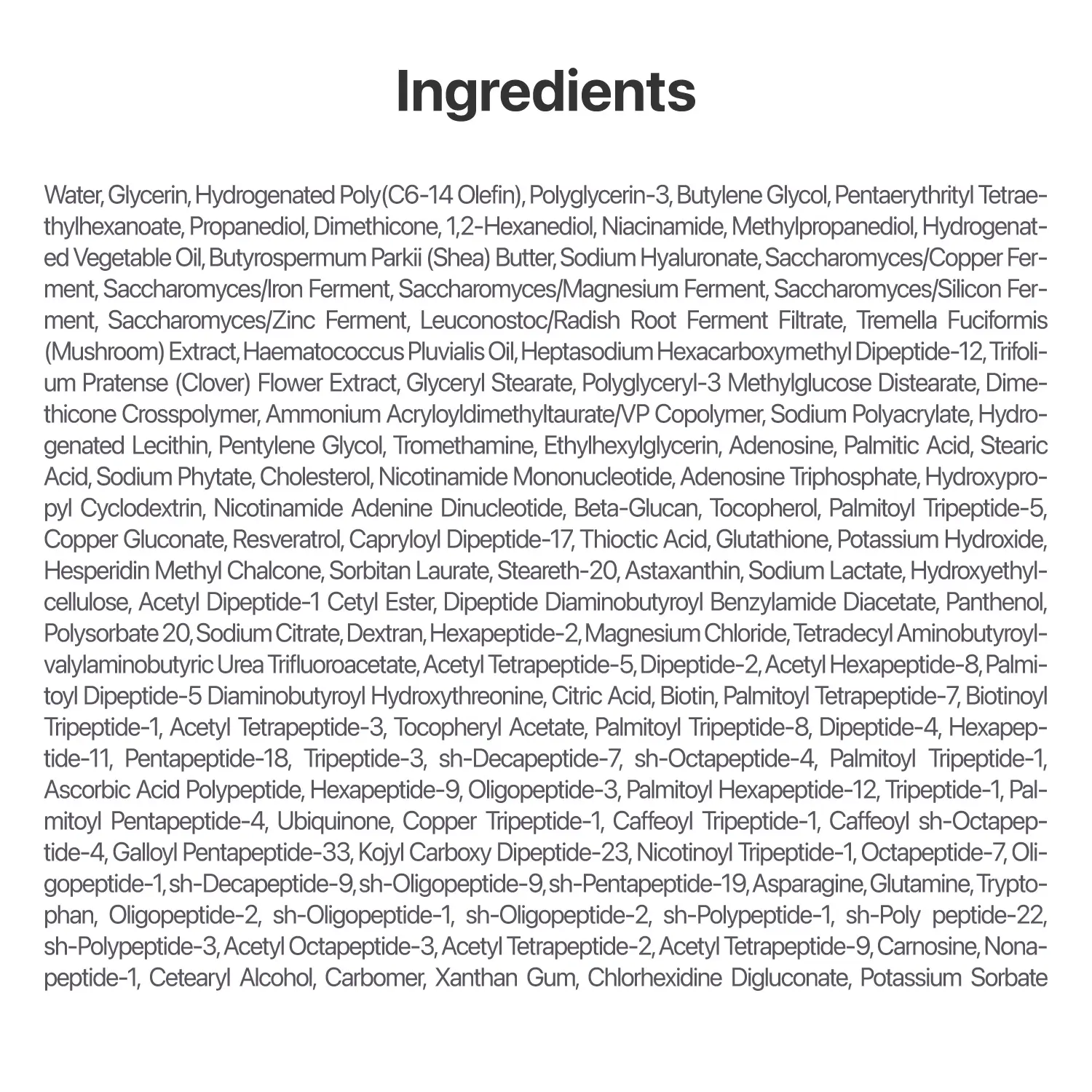 Formulated with NAD+, an anti-aging ingredient that enhances cell turnover, stimulates collagen production, and promotes skin repair along with 50 types of peptides to plump and firm the skin.