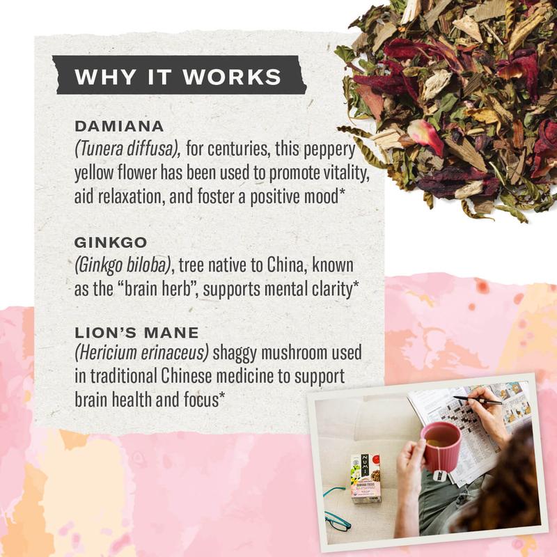 Numi Organic Damiana Focus Tea with Ginkgo Leaf Lion's Mane Hibiscus & Rosemary for Focus Memory & Cognitive Function Caffeine Free Plastic Free