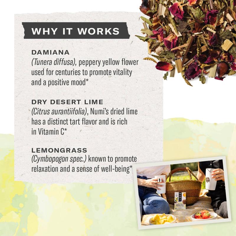 Numi Organic Damiana Uplift Tea - Zesty Blend of Damiana Desert Lime Lemongrass Lemon Balm & Licorice Root - Plastic Free Tea Bags - Caffeine Free
