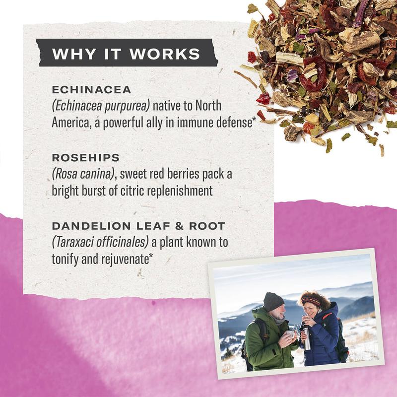 IngredientsOrganic echinacea leaf & stem,organic rosehip fruit,organic dandelion root,organic dandelion leaf & stem,organic ginger root,organic cinnamon bark,organic licorice root